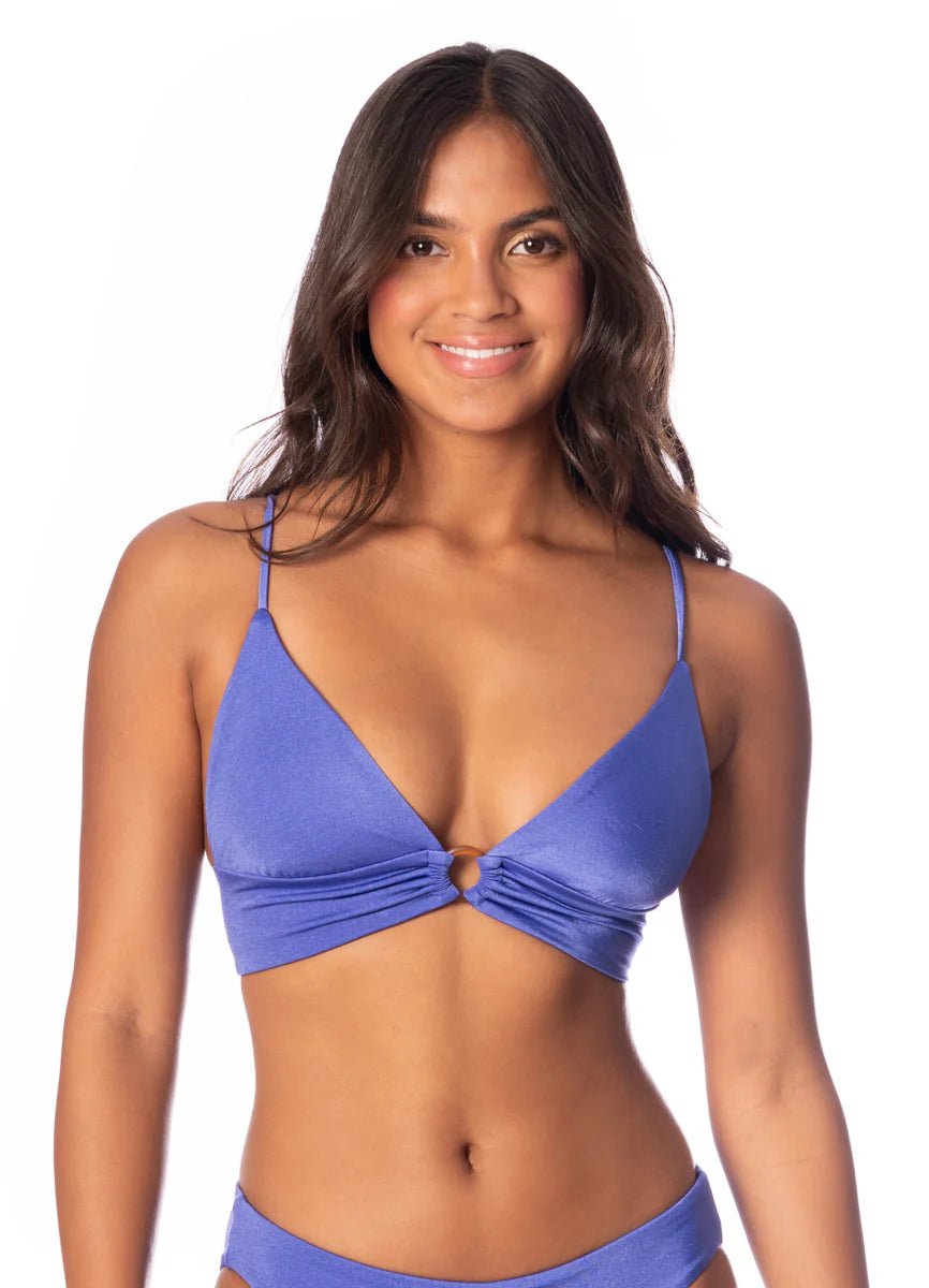 El top de bikini Zen tiene una moderna copa triangular deslizante, tirantes ajustables, cobertura baja y estampado reversible.