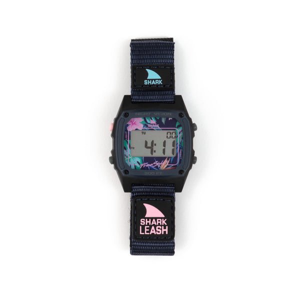 La correa de velcro original que lanzó los relojes Freestyle en los años 80 ha vuelto y es mejor que nunca. El sistema de cierre de velcro de la correa para tiburones sigue el modelo de una correa para tabla de surf estilo años 80 y viene cargado con funciones digitales estándar como: hora, fecha, cronómetro, cuenta regresiva, alarma y retroiluminación de visión nocturna.