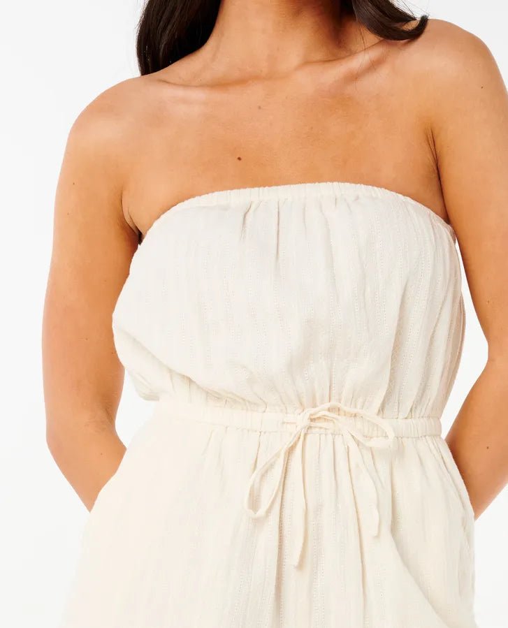 El mono Rip Curl Neon Isles en color hueso ofrece un ajuste relajado y cómodo, confeccionado en tela dobby a rayas 100 % algodón. Su cintura elástica y cordón ajustable garantizan una silueta favorecedora, mientras que el lavado con suavizante le da un tacto suave y desgastado. Ideal para días de playa o tardes frescas junto a la chimenea, este mono combina a la perfección con sandalias y tu bolso de playa favorito para una comodidad sin complicaciones durante todo el día.