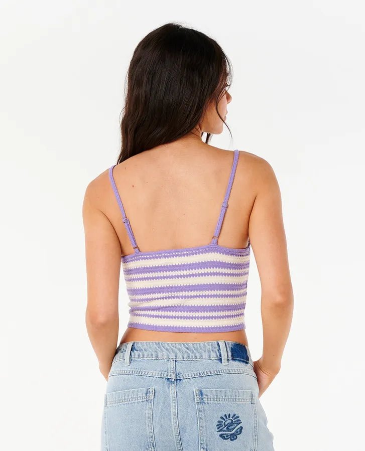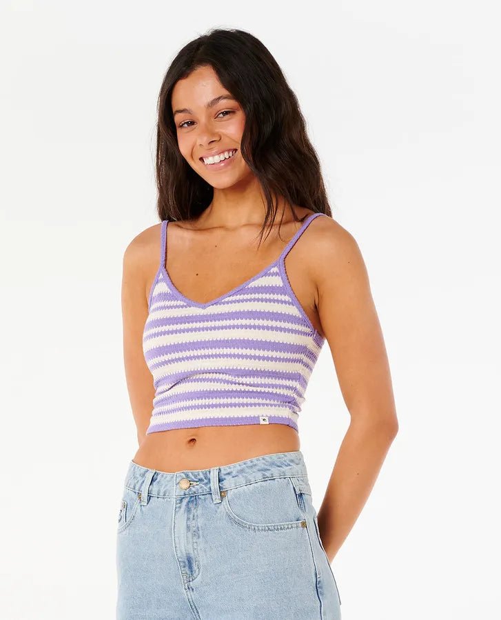 Da rienda suelta a tu lado más juguetón con la camiseta Bobbi Stripe de Rip Curl para mujer. Esta camiseta sin mangas presenta un diseño corto y elegantes rayas que seguro llamarán la atención. ¡Prepárate para causar sensación con esta divertida y coqueta camiseta morada!