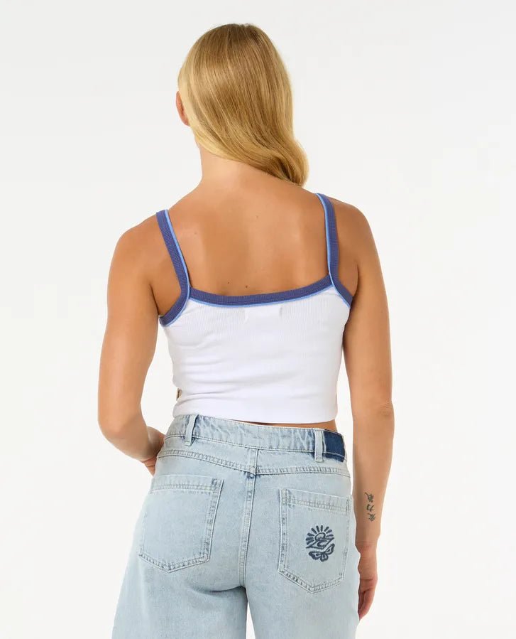 Prepárate para lucir un estilo veraniego con la camiseta de tirantes Las Dalias Baby de Rip Curl para mujer. Confeccionada en una mezcla de algodón y elastano, esta camiseta ofrece un ajuste ceñido y cómodo. Su diseño de camisola con delicados bordados y ribetes le da un toque divertido y femenino, ideal para usar en capas o sola. La calidad está garantizada con la etiqueta tejida con la bandera.