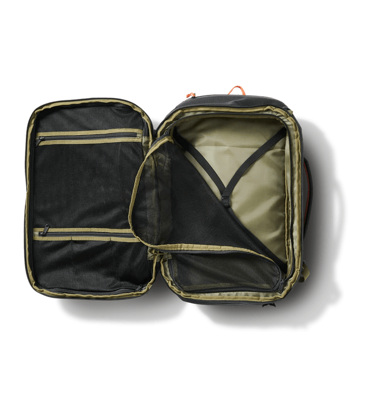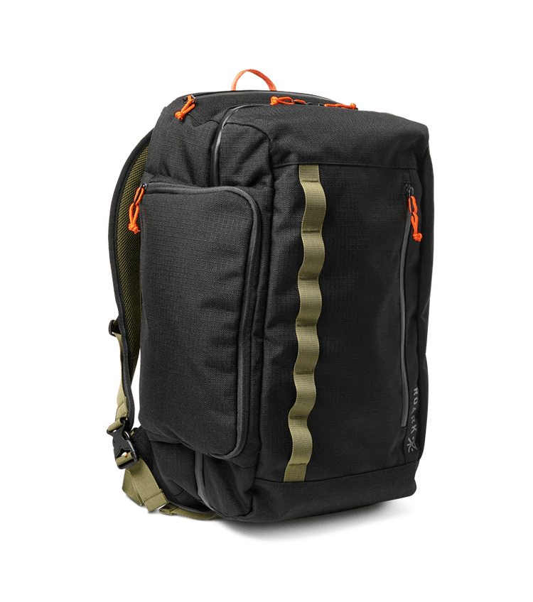 The Roark "3 Day Fixer" 35L Bag in black is designed to keep your essentials organized and accessible during short trips. Made from durable 1050 denier ripstop fabric, it features dual zipper compartments with mesh zip flaps to separate your clothes securely. A padded laptop pocket and a hidden passport pocket add convenience and protection for your valuables. With its comfortable carry design and thoughtful organization, this bag is ideal for frequent travelers seeking simplicity and reliability in a compact carry-on.