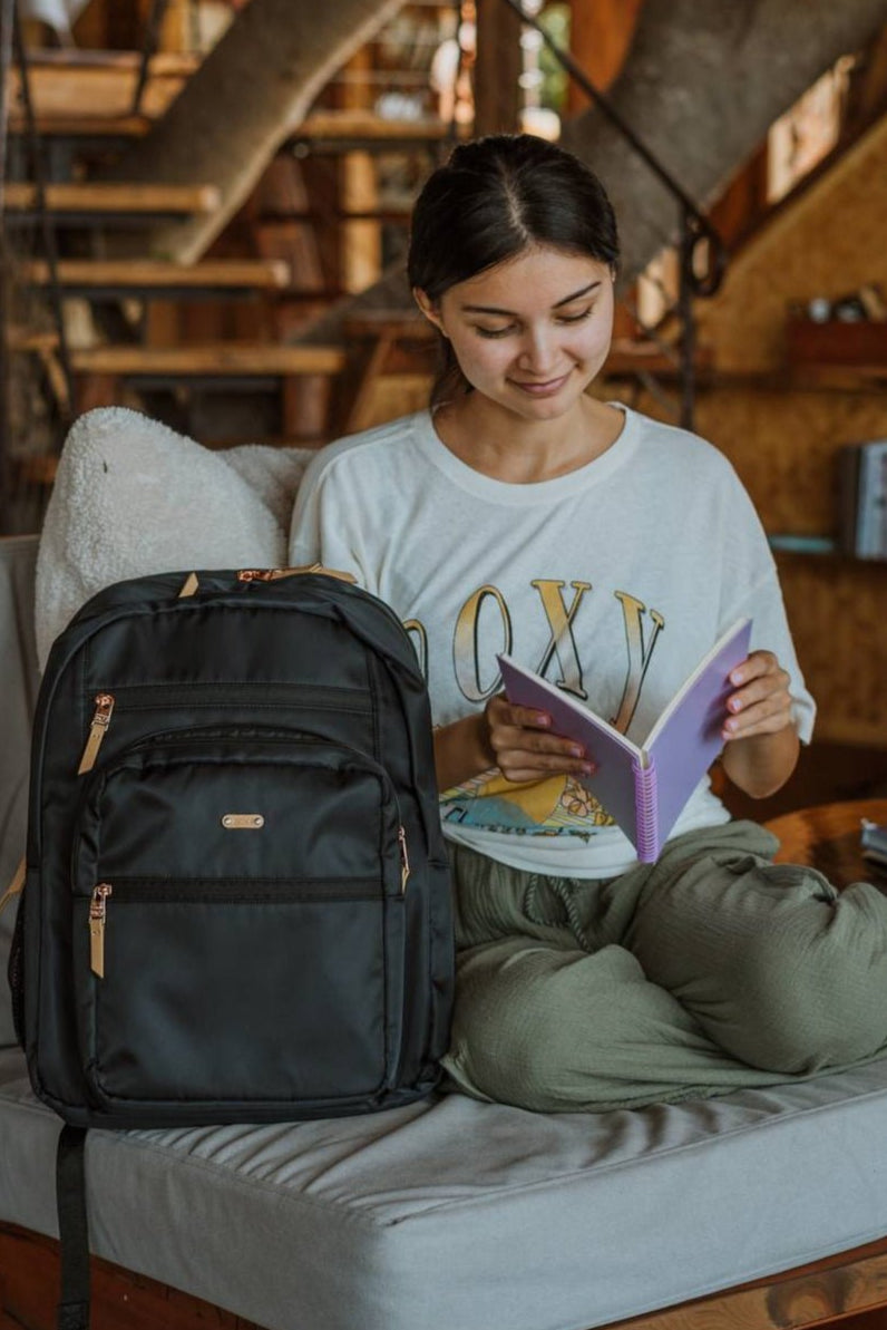- Organiza tus bolígrafos y otros útiles escolares en el bolsillo delantero.