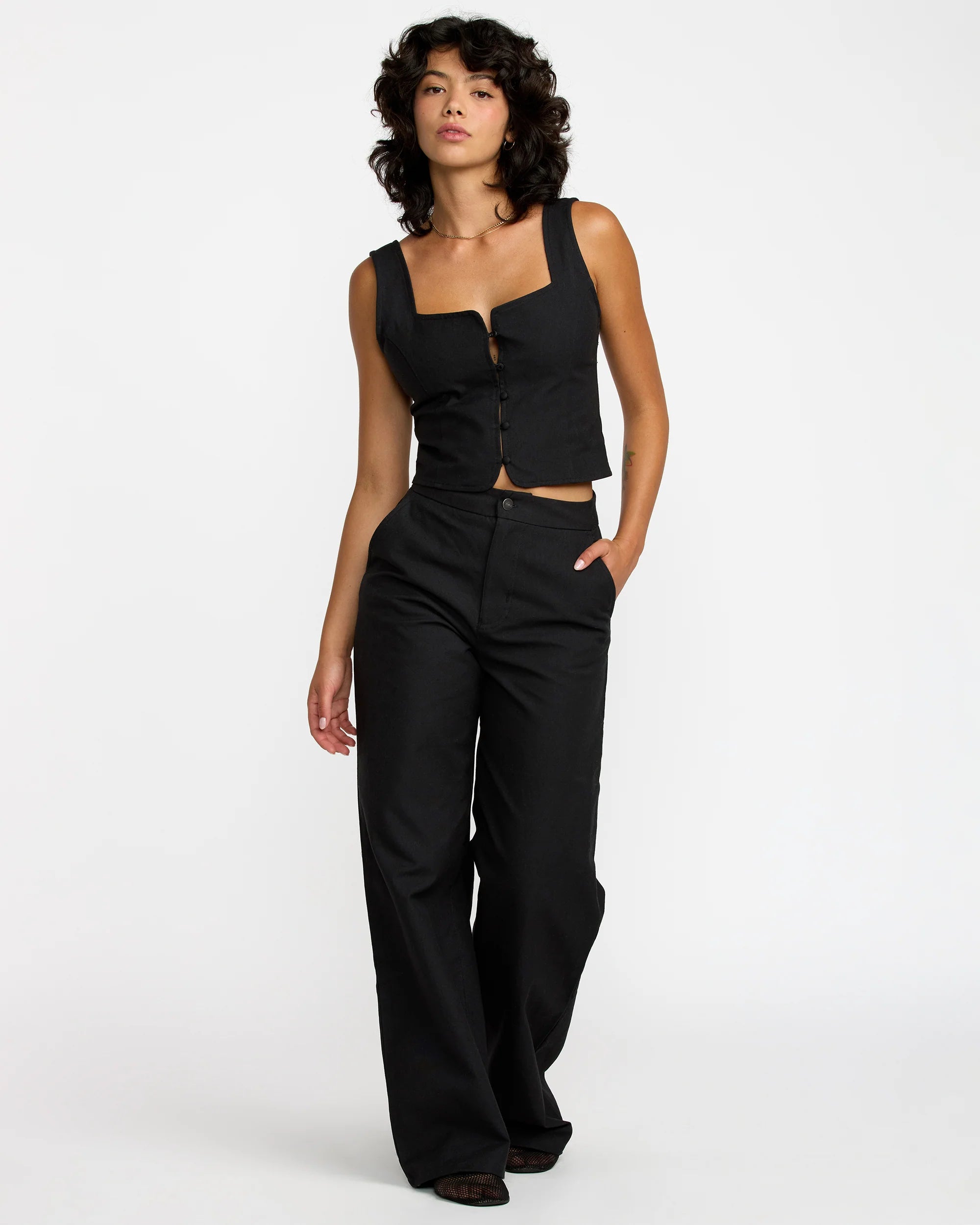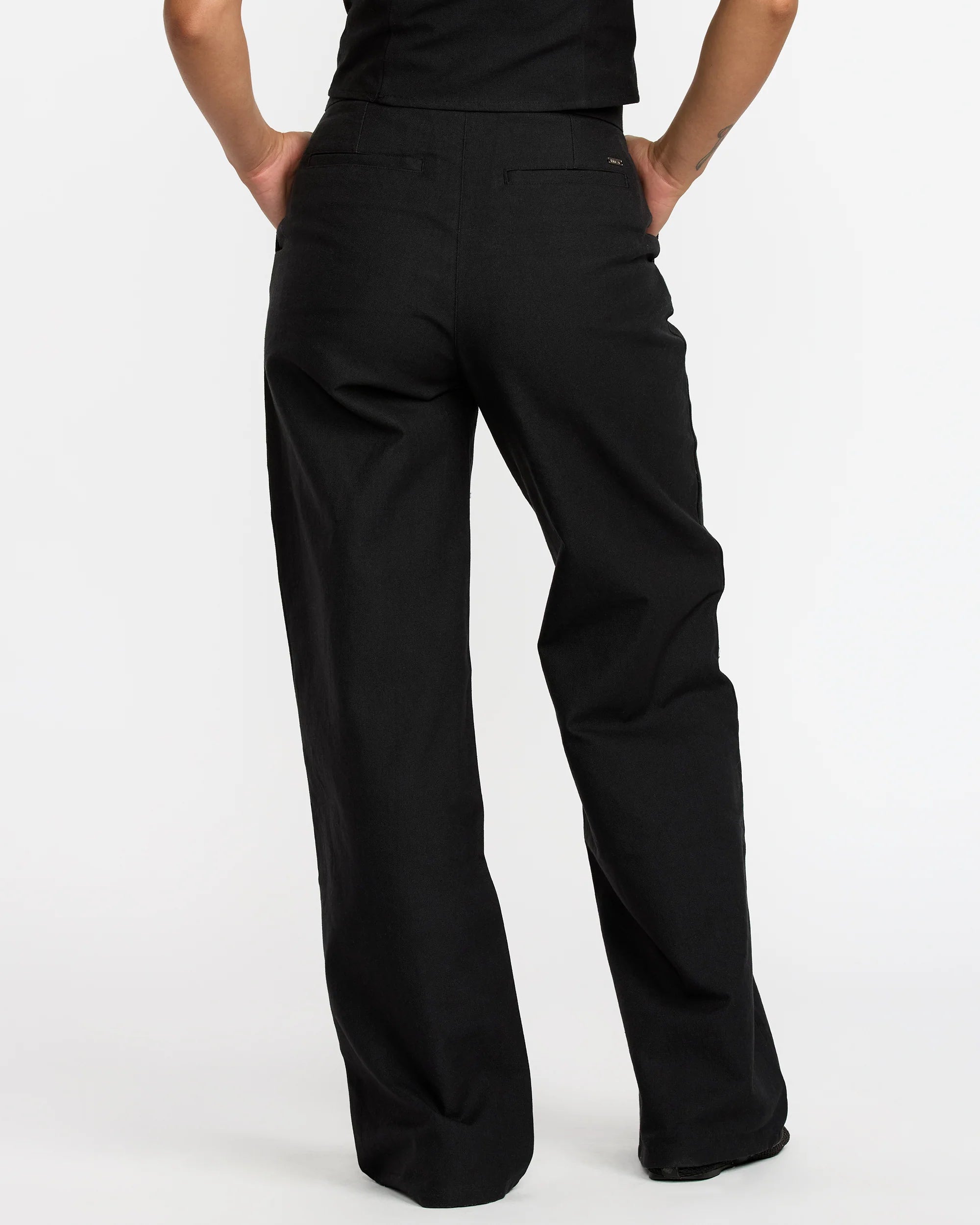 Estos pantalones "Bonnie" de RVCA para mujer, en elegante negro, presentan una silueta ajustada que realza tu figura y te ofrece comodidad. Diseñados con elegantes bolsillos de ribete delanteros y traseros, ofrecen detalles sutiles y son prácticos. Con la distintiva etiqueta RVCA Solo Label, estos pantalones combinan estilo y una discreta marca para un look versátil y moderno. Perfectos para realzar tu armario diario con un toque de sastrería.