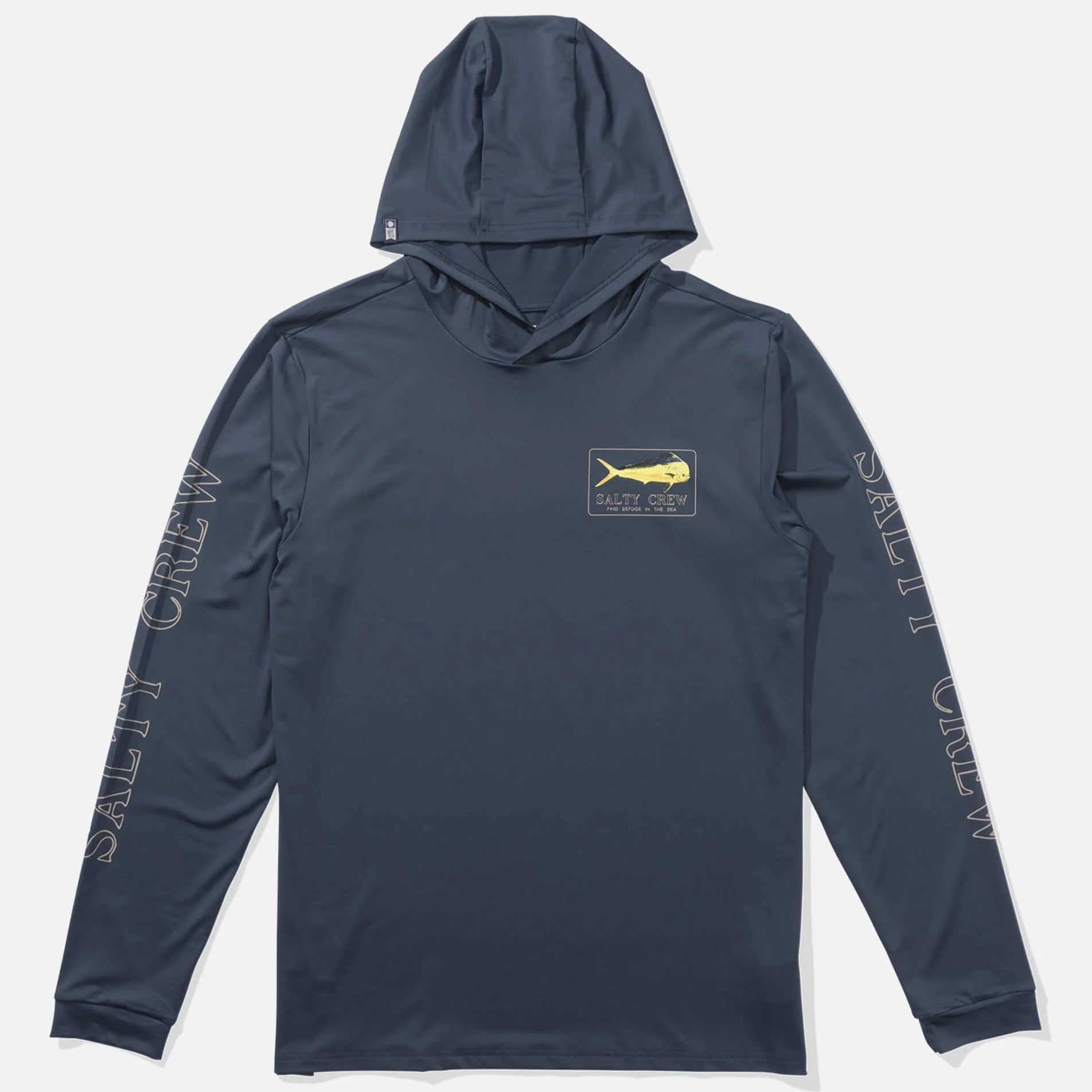 La camiseta con capucha Salty Crew "Golden Mahi" en color azul aleta ofrece protección UPF 50+ para protegerte de los dañinos rayos del sol. Fabricada con 86 % poliéster reciclado y 14 % elastano, su tejido ligero y elástico en cuatro direcciones garantiza libertad de movimiento. Diseñada con propiedades absorbentes de humedad y antimicrobianas, te mantiene cómodo y fresco durante tus actividades al aire libre. La camiseta luce elegantes diseños serigrafiados en la parte delantera, trasera y mangas, que combinan rendimiento con un estilo distintivo.