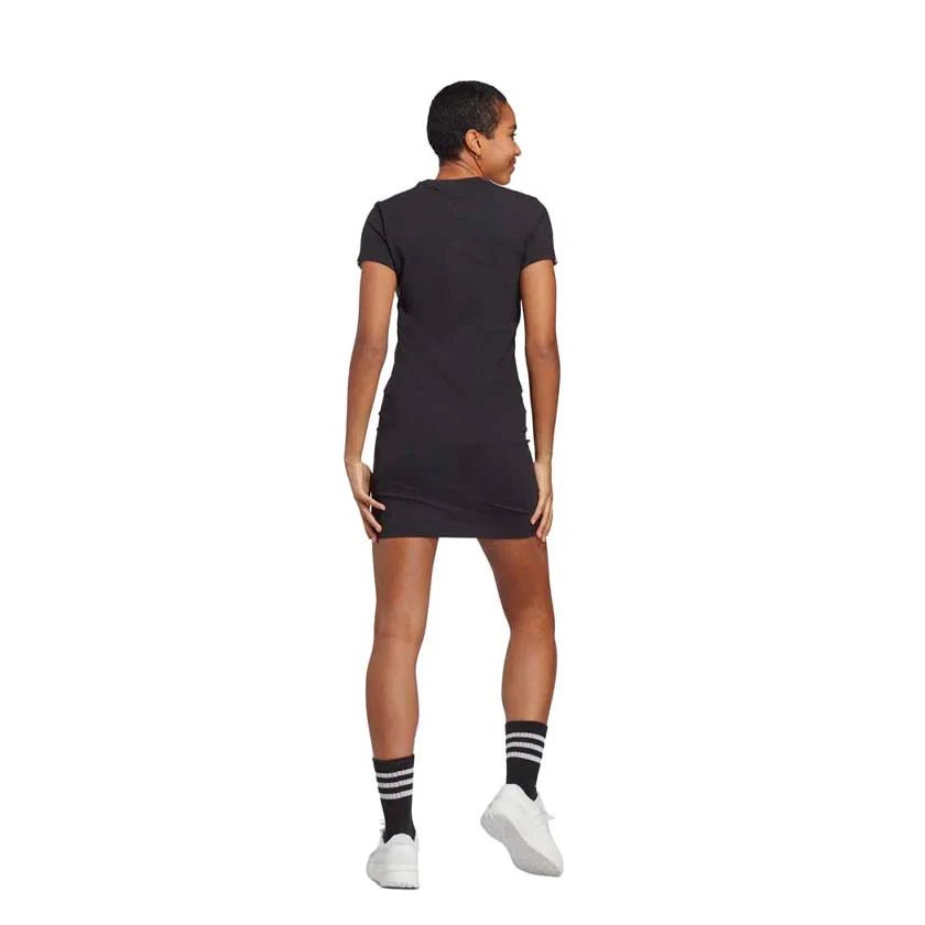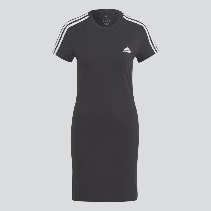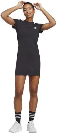 Designed for warm days, the Adidas Women's Essentials 3-Stripes Single Jersey Fitted Short Dress offers comfort and ease with its soft, body-hugging shape. Featuring Better Cotton for sustainability, this dress is perfect for any casual occasion. Pair with sandals or sneakers for a sporty yet fashionable look.