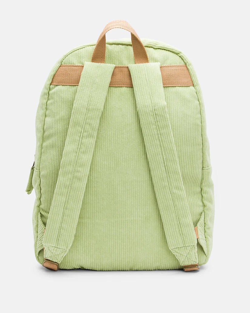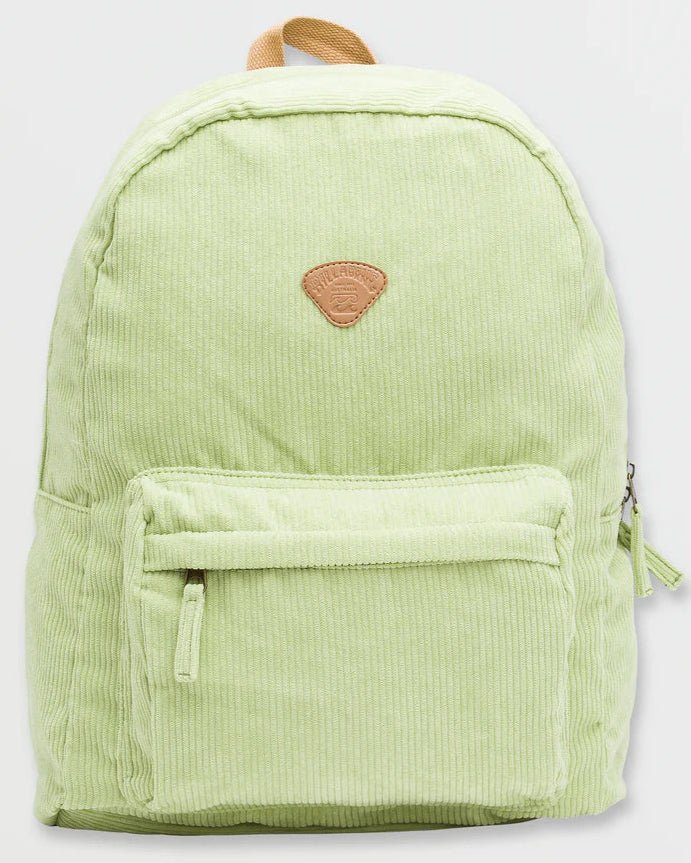 The Billabong "School's Out" Corduroy Backpack in Avocado is designed to keep up with your busy day. Its 20-liter cotton shell offers ample space for books, a hoodie, and a laptop, while padded adjustable straps ensure comfortable carrying. An interior sleeve protects your devices, and the quick-grab front pocket with sturdy pulls keeps essentials within easy reach. Perfect for school or casual outings, this backpack combines practicality with a stylish corduroy finish.