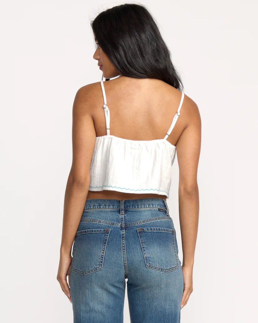 This lightweight cotton tank combines delicate embroidery with subtle screen-printed details, offering both comfort and feminine style. Its regular fit ensures an easy, flattering silhouette, while the premium metal plate accent adds a chic, understated touch. Available in classic white, it’s an ideal piece for effortless, everyday cool.