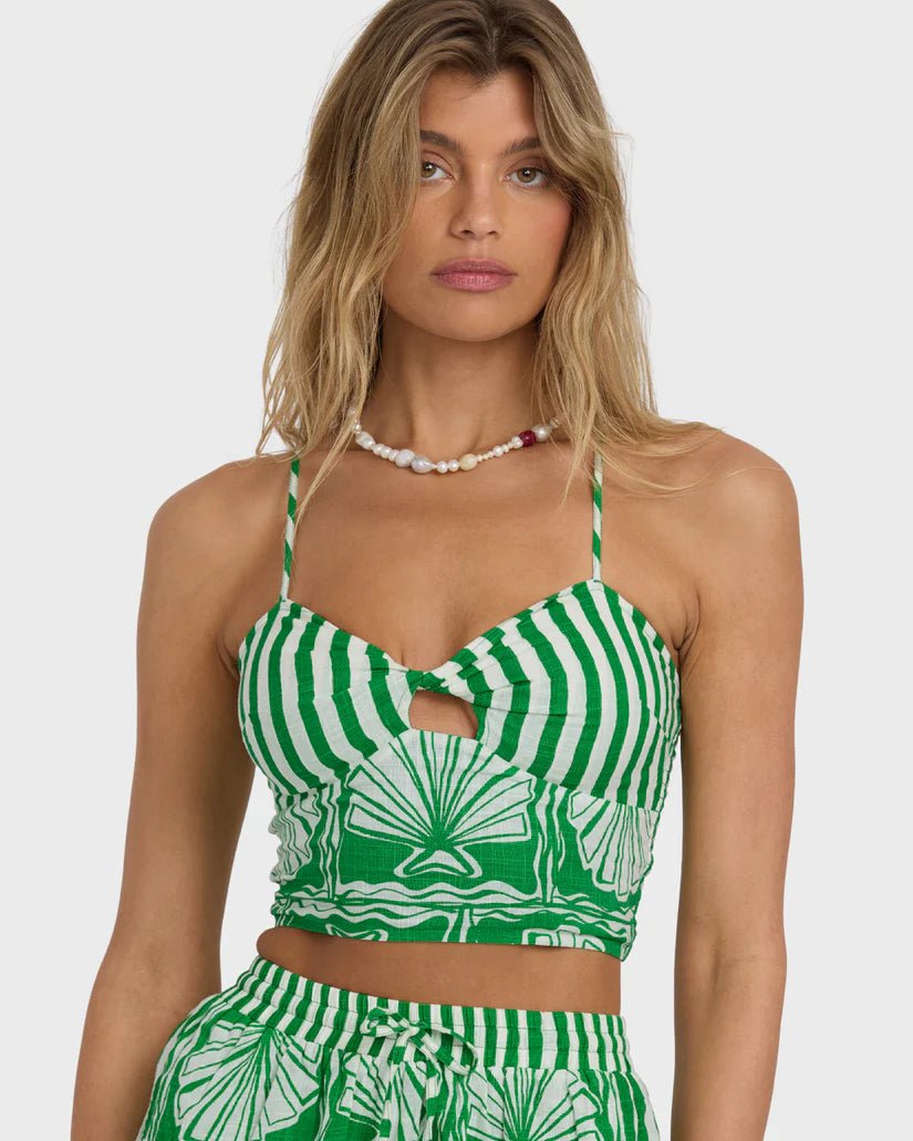 Billabong Women's "Sea Shell" Tank in Kelly Green delivers effortless summer style with thoughtful design details. This cropped cotton tank features a twisted bust, delicate cut-out, and smocked back for a flattering fit that moves with you. Contrast prints and metal hardware elevate the look, making it perfect for beach days, casual outings, or layering over your favorite swimwear. Lightweight and breathable, it's the ideal piece for warm-weather adventures.