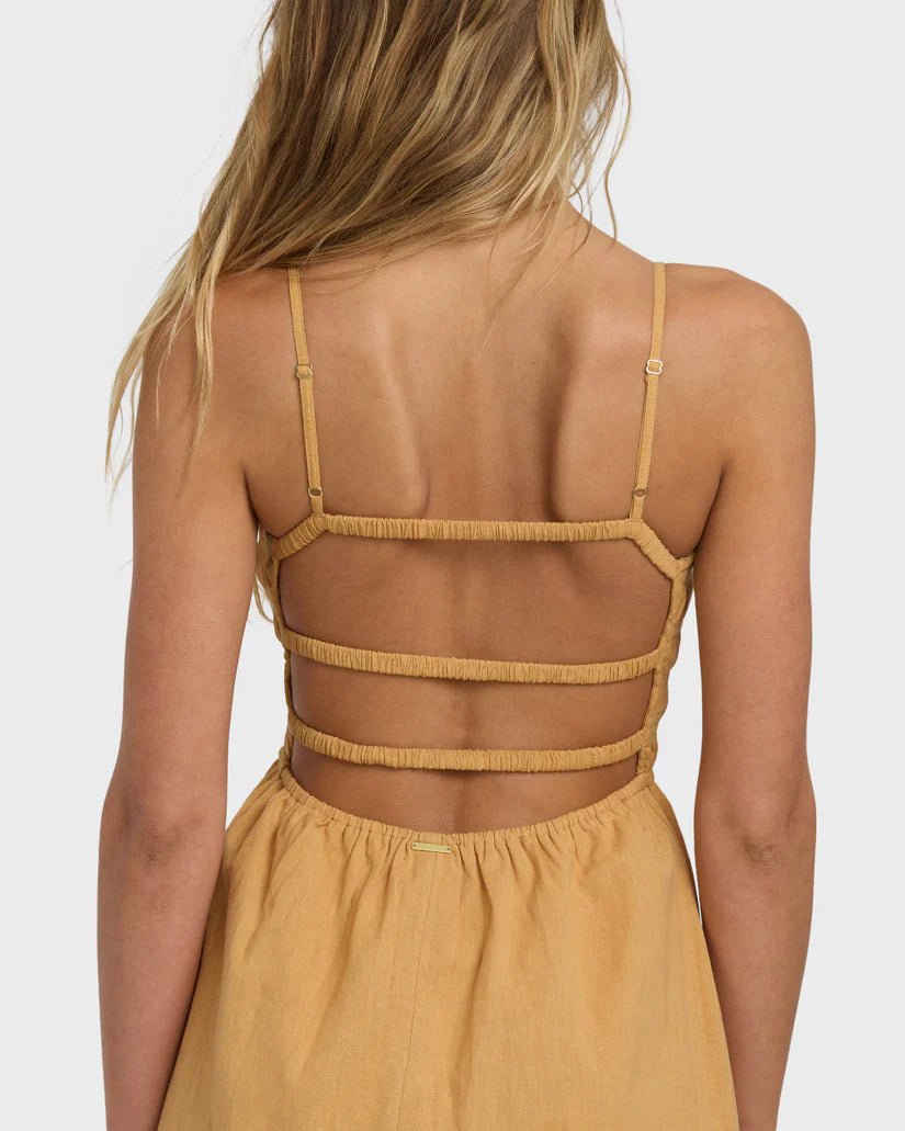 Embrace effortless summer days in this cotton-linen mini dress designed for movement and comfort. The fitted, smocked bodice creates a flattering silhouette while the flowing skirt keeps you cool and carefree. An open-back design delivers that perfect hint of edge, secured with elastic detailing for all-day confidence. Ideal for beach trips, casual outings, or sunset gatherings, wherever the season takes you.