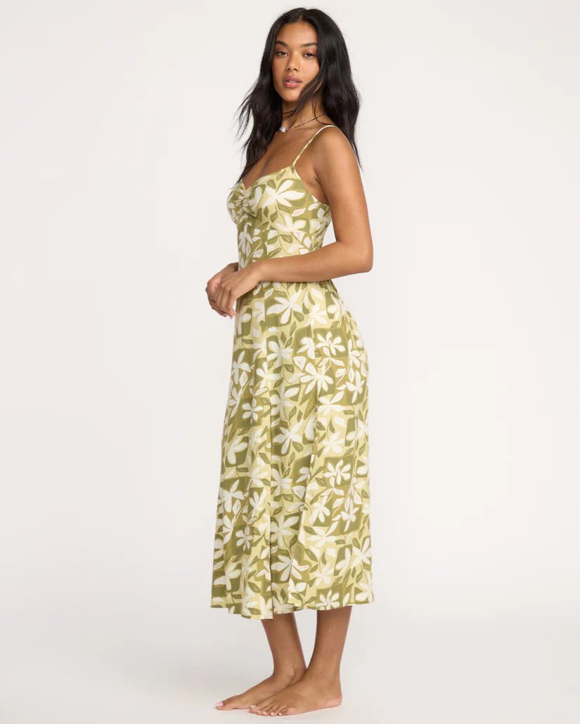 This flattering midi dress features a sweetheart neckline and a subtle front slit, adding a touch of effortless elegance. The smocked back bodice offers a comfortable, tailored fit, while the soft viscose fabric ensures all-day comfort. Presented here in a gentle light olive shade, it’s perfect for day-to-night wear with a graceful, feminine silhouette.