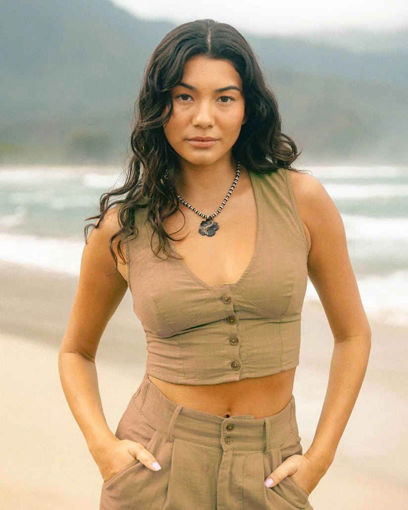 Crafted from premium double slub gauze cotton, this cropped vest delivers effortless style with a refined edge. The sleek metal plate detail adds a modern touch, while the front button closure ensures a custom-tailored fit that flatters every frame. Versatile enough to layer over tees or wear solo, it's the perfect piece for riders who value quality construction and understated sophistication. Available in a rich Dijon yellow that commands attention.