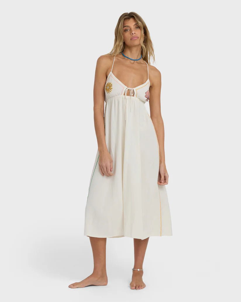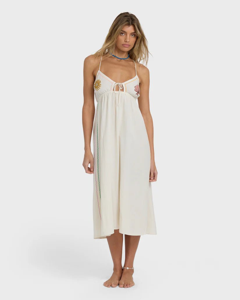 The Wave Haze Midi Dress combines effortless elegance with thoughtful design details. A fitted bodice flows into a relaxed skirt, creating a flattering silhouette perfect for warm days and casual outings. Decorative embroidery and a subtle cut-out add feminine charm, while the placement print brings just enough visual interest without overwhelming the look. Crafted for comfort and style, this dress transitions seamlessly from beach to town. Available in crisp White.