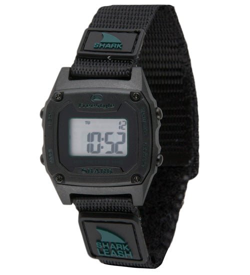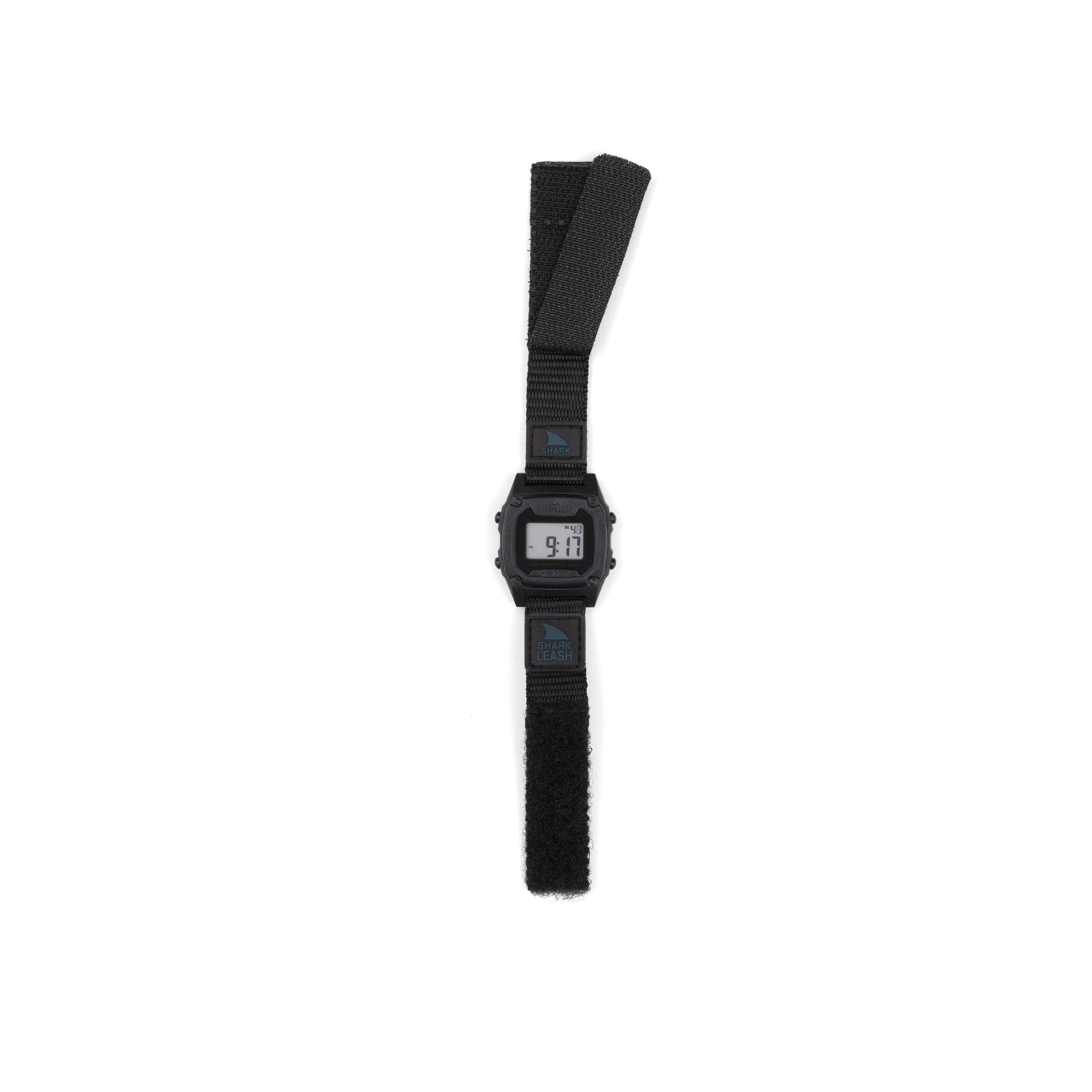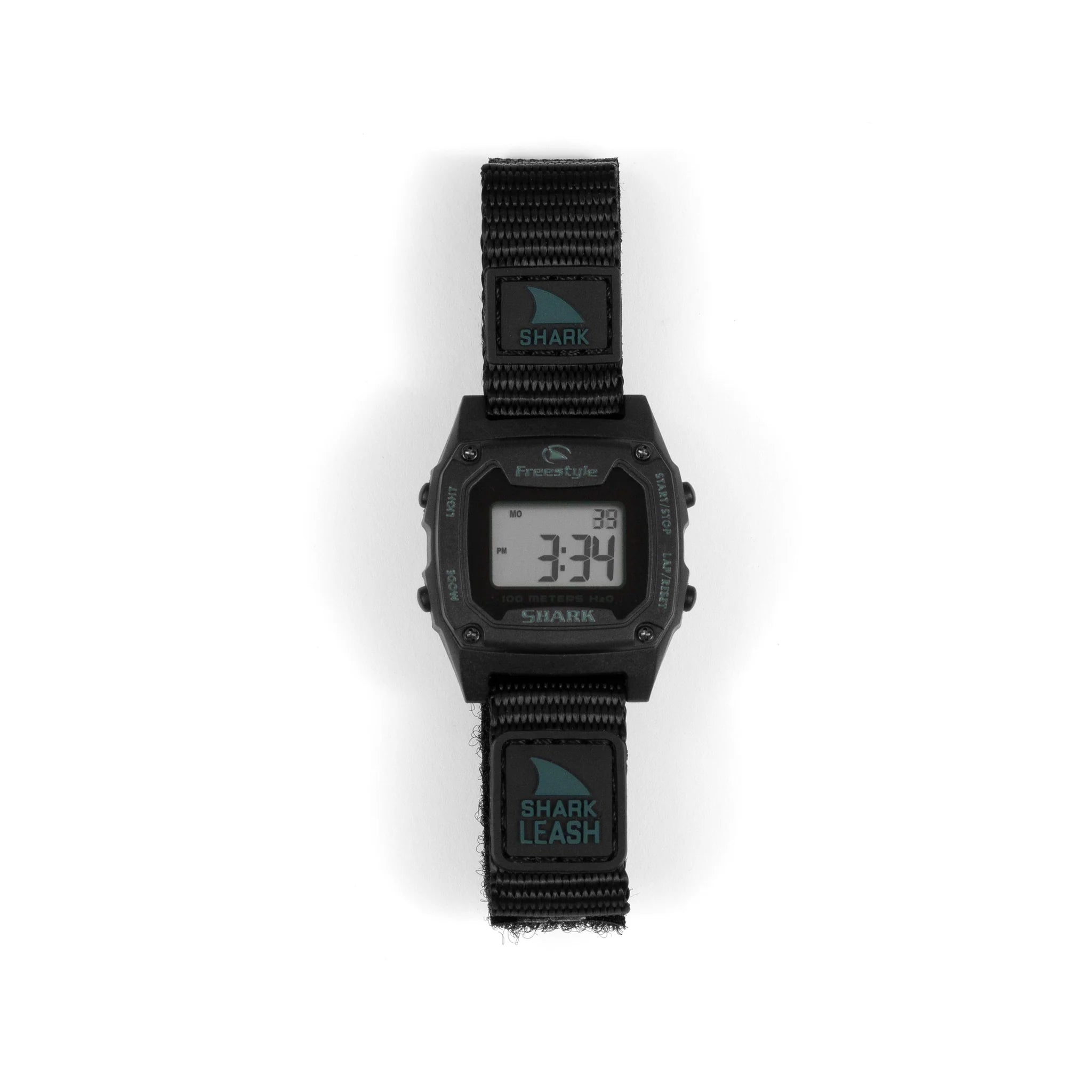 The Freestyle Shark Classic Mini Leash Watch in black features a compact 30mm case tailored for smaller wrists, combining comfort with practical functionality. Designed for active lifestyles, it includes an alarm, dual time display, countdown timer, stopwatch, and night vision backlight. Water-resistant to 100 meters and backed by a limited lifetime warranty, this durable watch is ready to support you every day with reliable performance.