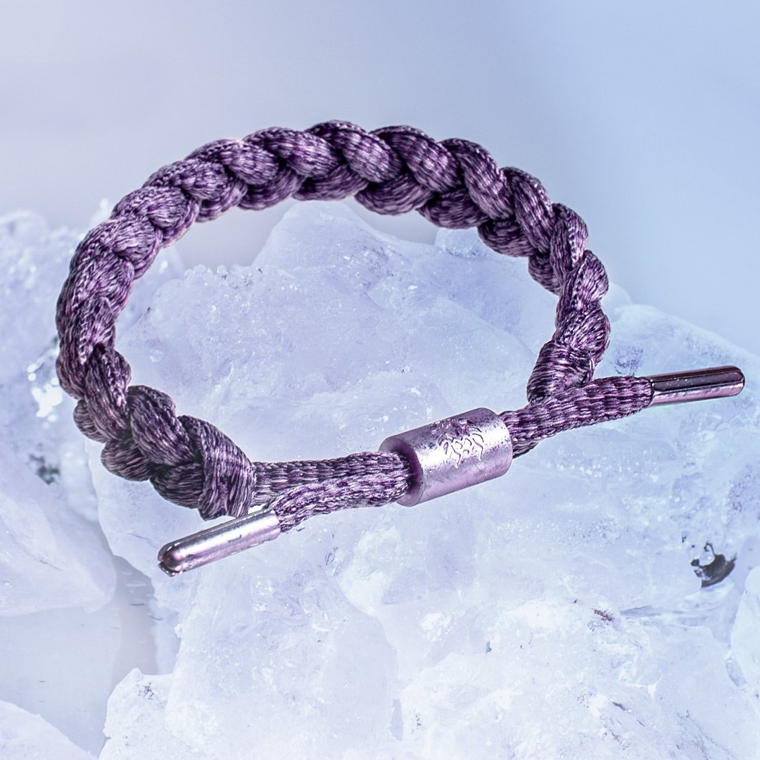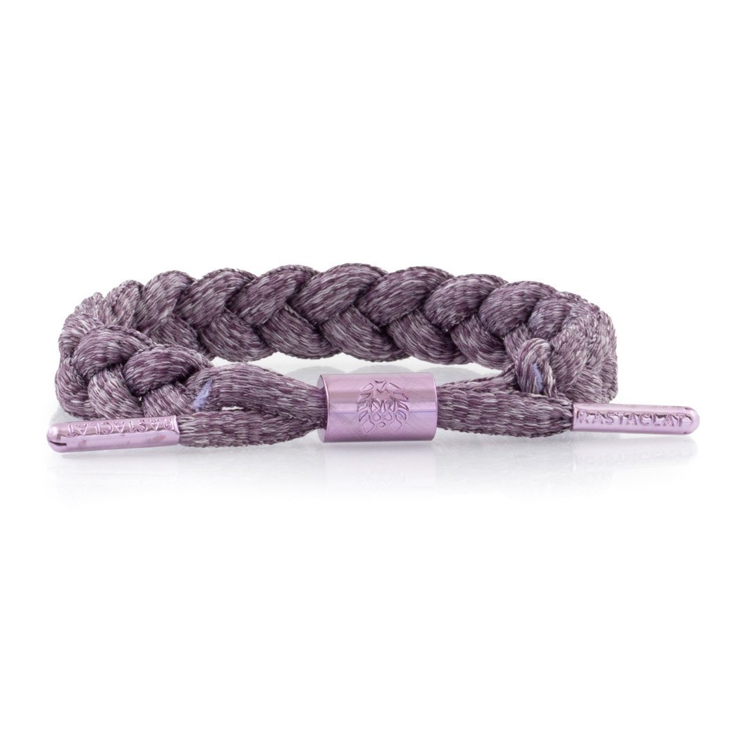 PURPLE AND PLUM HEATHERED BRAIDED BRACELET FEATURING FROST ELECTROPLATED HARDWARE AND DEBOSSED LOGOS.