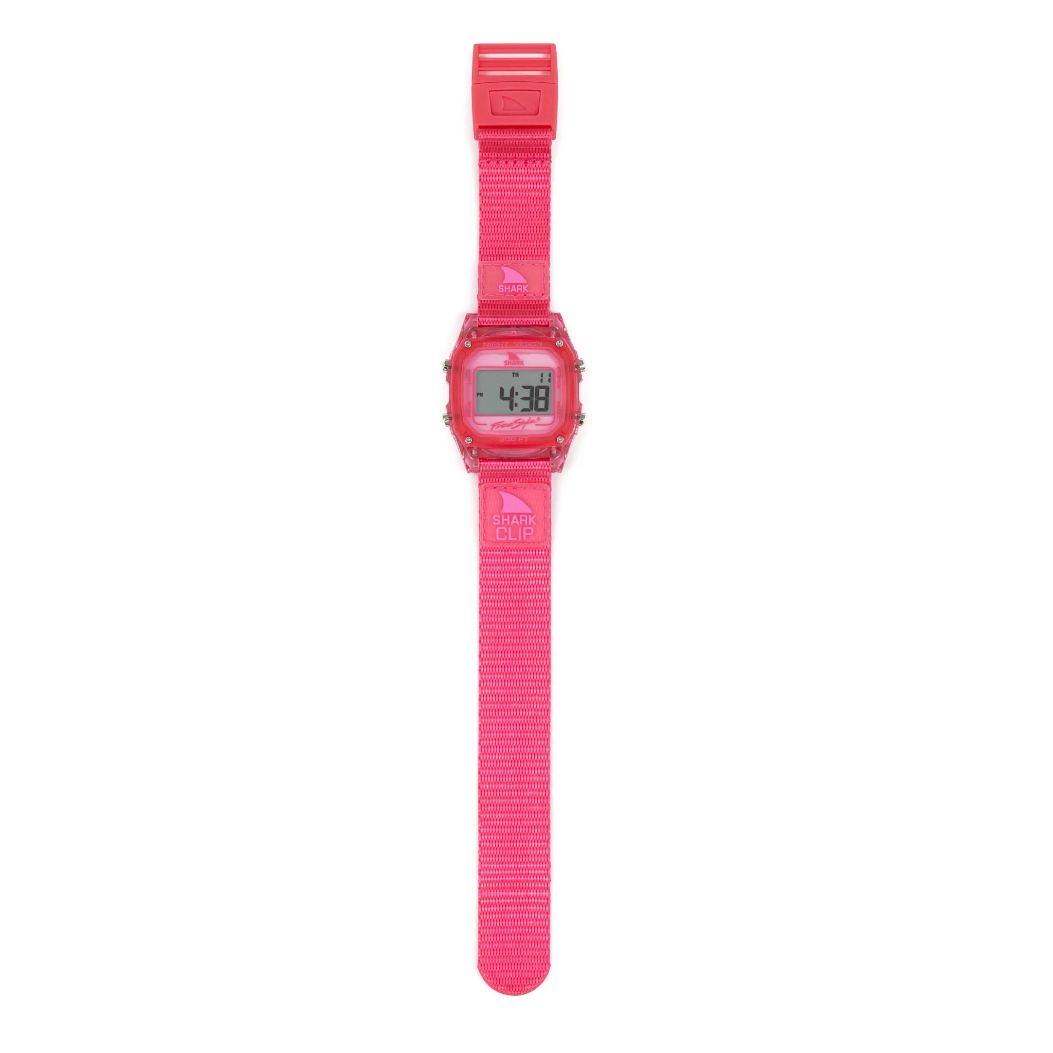 Embrace the summer spirit with the Freestyle Shark Classic Clip Watch in Cherry. Its transparent red case and bold cherry strap with signature see-through patches offer a fresh, vibrant look. Designed for water adventures, this watch resists water up to 300ft and features a secure Shark Clip closure for comfort. Stay on schedule with a stopwatch, timer, alarm, and backlight for low-light visibility. Combining reliable performance with eye-catching style, it’s the perfect companion for your sunny days and active lifestyle.