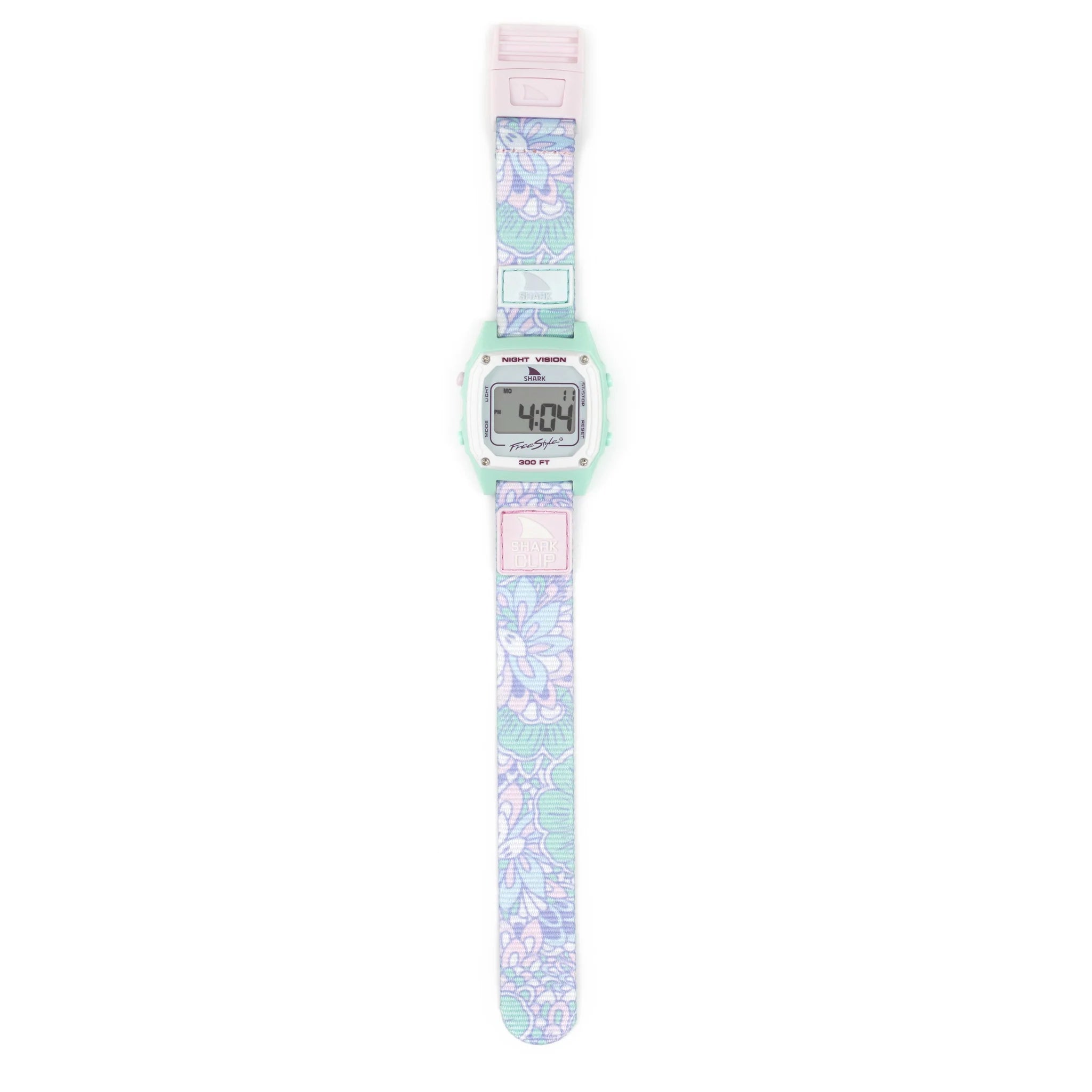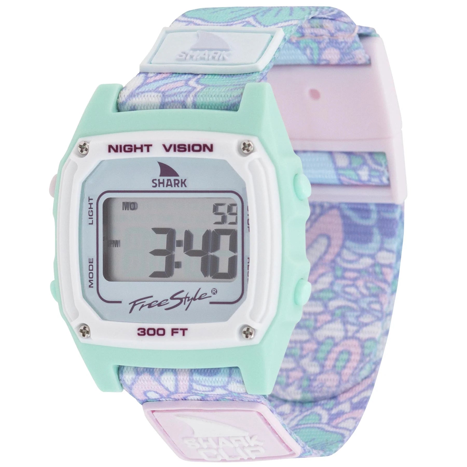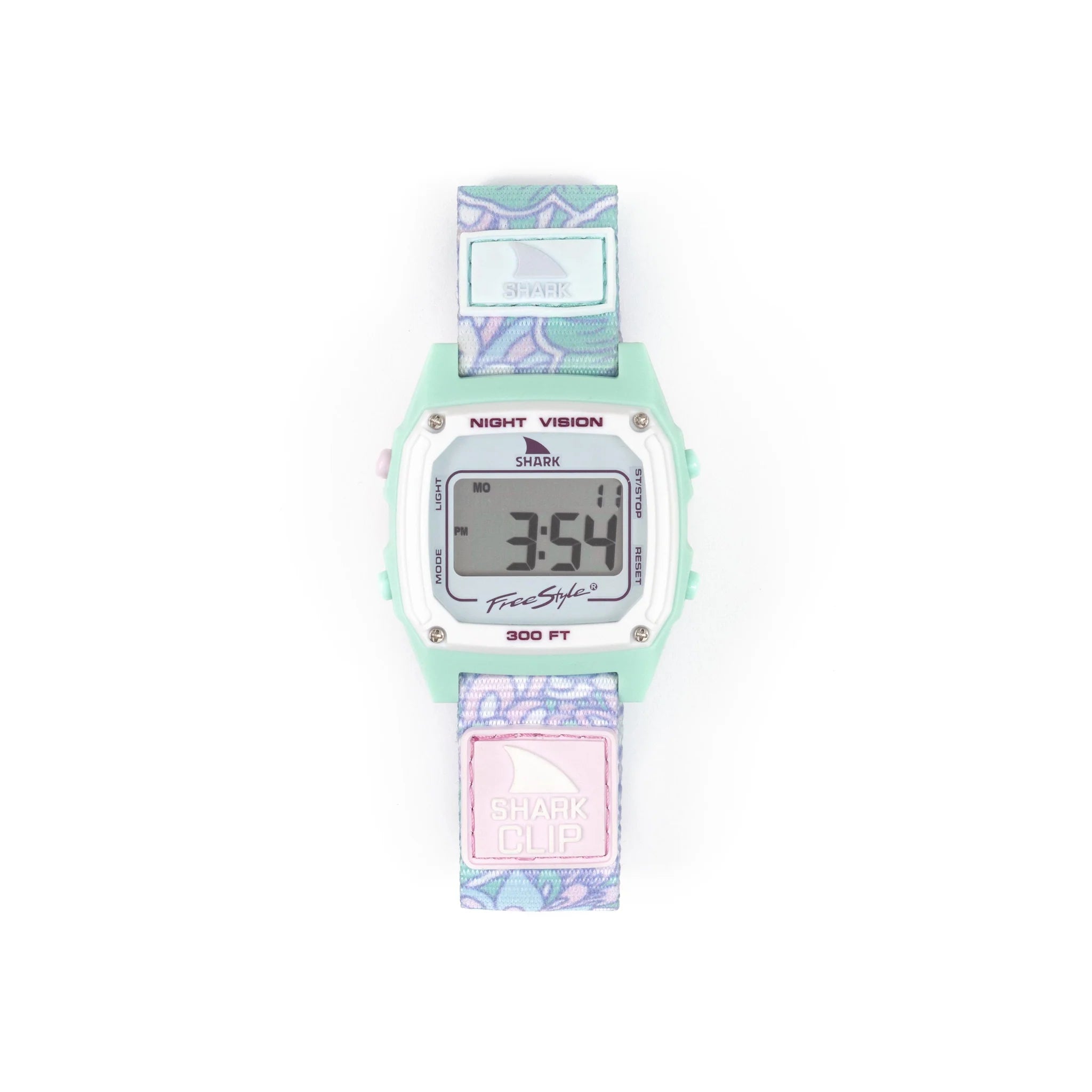Step into the vibrant 60s surf vibe with the Freestyle Shark Classic Clip Watch in Mint Paisley. Featuring colorful paisley patterns in soft mint, pink, and purple, this watch combines retro style with practical digital functions like time, date, stopwatch, timer, alarm, and backlight. The secure Clip closure keeps it comfortable and ready for your endless summer adventures. Water-resistant up to 100 meters and protected by a Limited Lifetime Warranty, it’s the perfect companion for surf sessions and beach days alike.