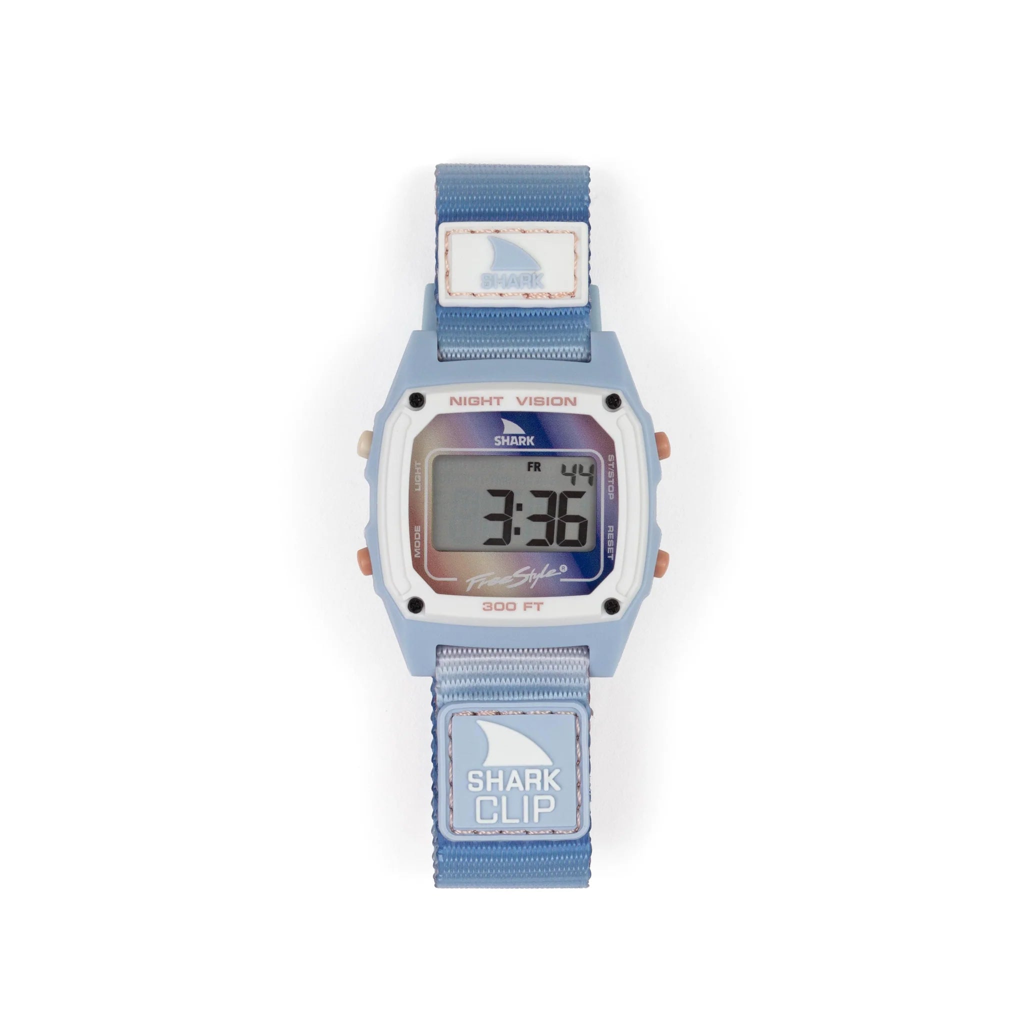 Embrace the serene beauty of dusk with the Freestyle Shark Classic Clip Watch - Skyline. This watch harmonizes soft blues and warm mauve tones, reflecting the calm of the sky just after sunset. Built for both water and everyday wear, it features a secure Shark Clip closure, 300 feet of water resistance, night vision backlight, dual time, alarms, a stopwatch, and a countdown timer. Inspired by the Pacific sky at dusk, the Skyline offers a timeless, coastal look that keeps you connected to golden hour’s tranquil glow wherever you are.