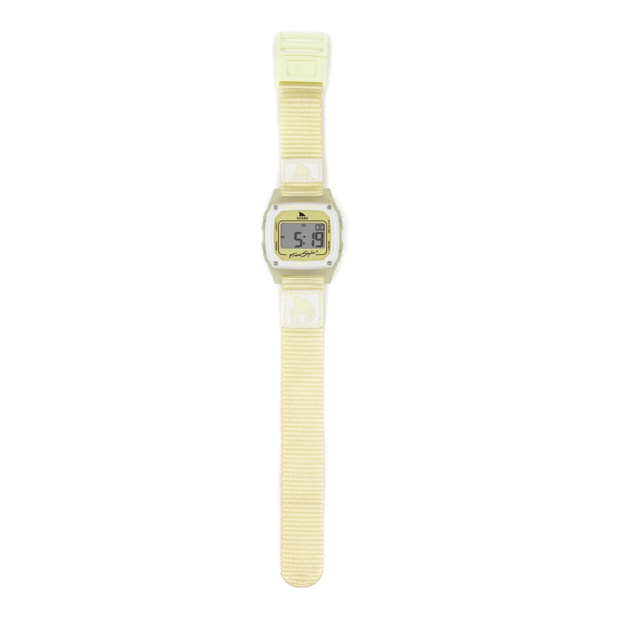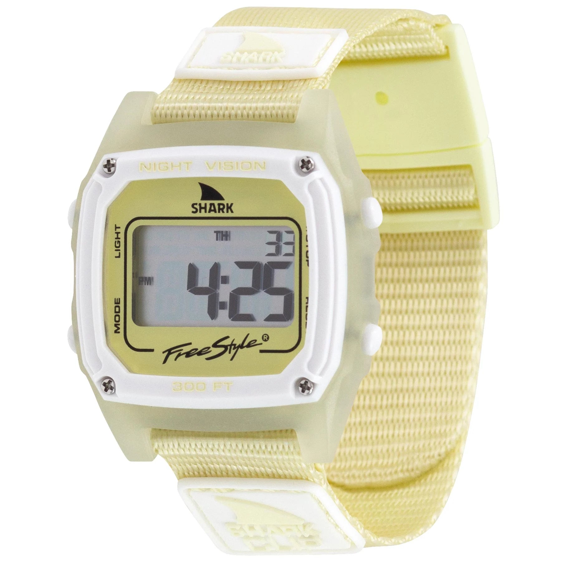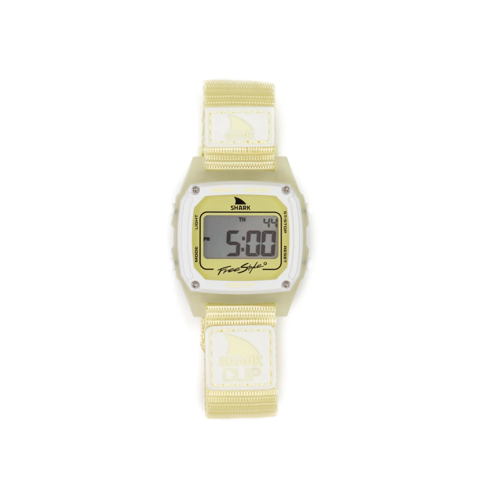 Brighten your day with the Freestyle Shark Classic Clip Watch in Sunshine. Featuring soft pastel yellows and a frosted semi-transparent case, this digital watch brings beachy warmth to your wrist. Its secure Shark Clip closure ensures it stays put during your surf or swim. Water-resistant and equipped with essential digital functions, it's designed to support your active lifestyle by the sea. Ideal for those who cherish sun, surf, and a splash of style.