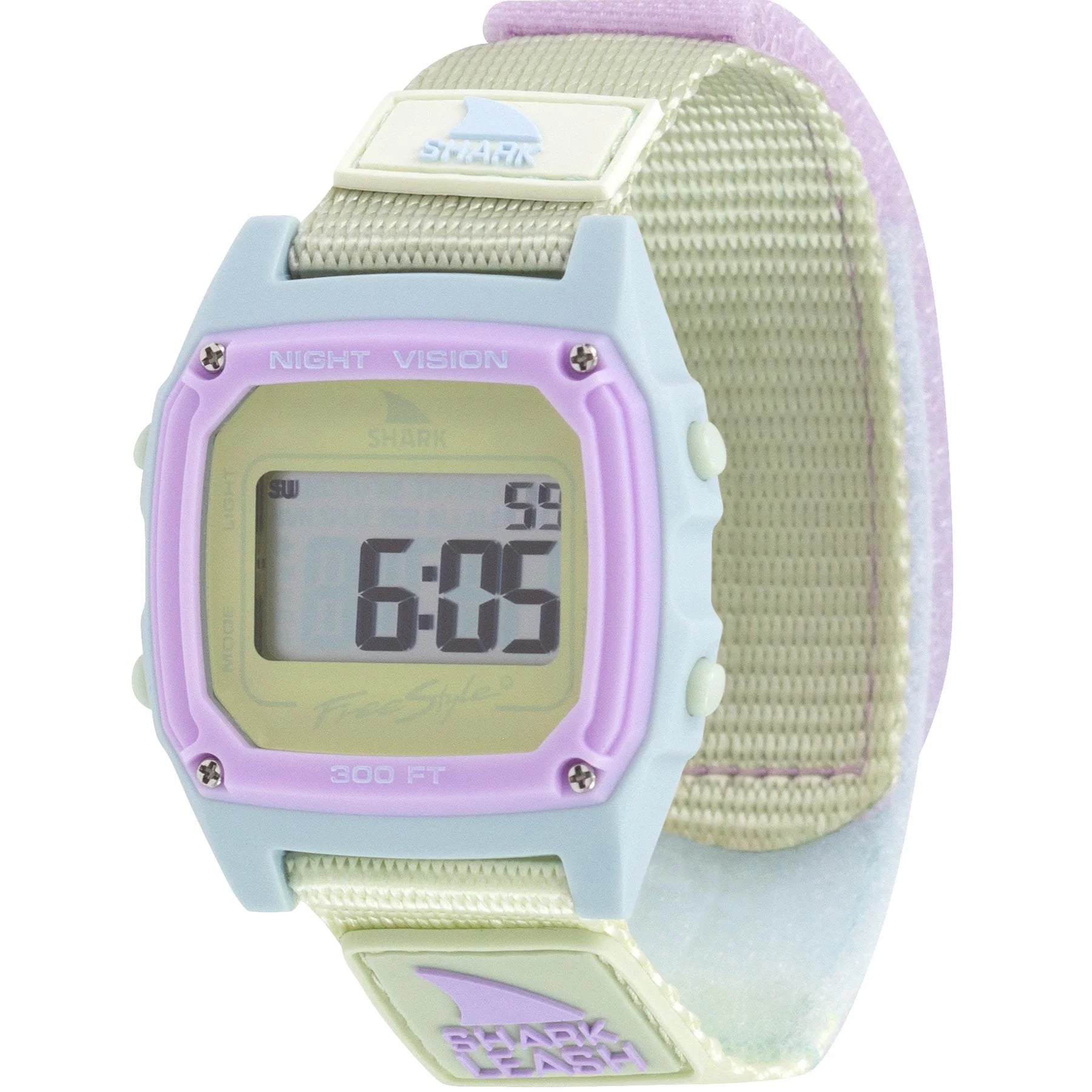 Experience summer with the Freestyle Shark Classic Leash Watch - Newport from the Sol Surf Collection. Featuring the iconic Shark Leash strap inspired by 80s surf culture, its hook and loop closure ensures a secure fit. This watch offers key digital functions like time, date, stopwatch, and timer, perfect for tracking your beach adventures. Its calming pastel hues of purples, lime greens, and deep blues capture a relaxed beach vibe. Water-resistant up to 100 meters and backed by a limited lifetime warranty, it’s designed to keep up with your seaside lifestyle.