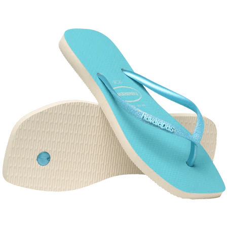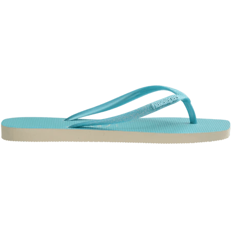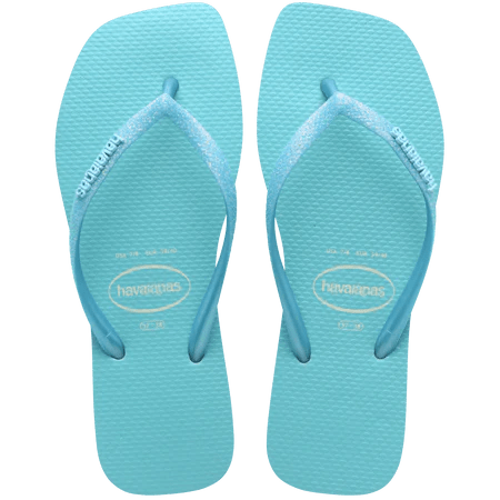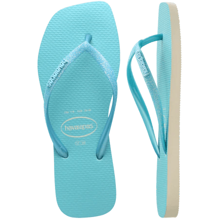 Elevate your summer style with Havaianas Women's Slim Square Glitter Flip Flops. Featuring a sleek, modern square-toe silhouette and delicate slim straps, these flip flops combine comfort with eye-catching sparkle. The glitter-accented straps and bold Havaianas logo add a playful yet sophisticated touch, available in vibrant neon shades including beige and blue. Perfect for adding a subtle charm to any casual outfit.