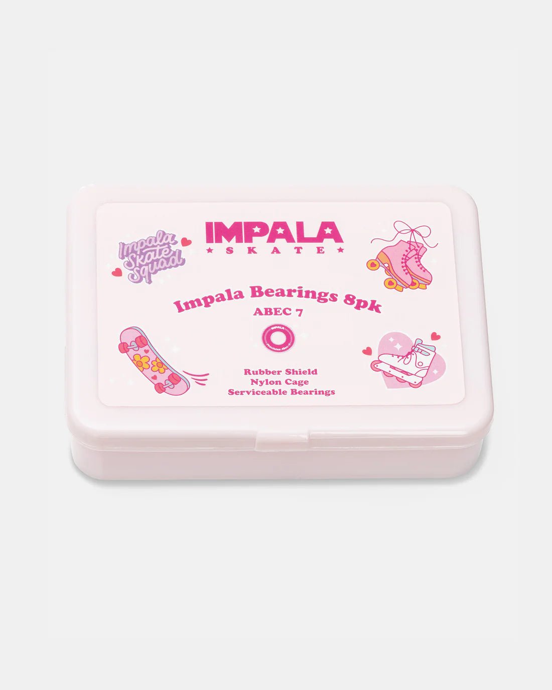 Upgrade your ride with the Impala ABEC7 Bearing Pack; Each pack includes 8 high-grade bearings with durable nylon cages that you can service yourself. Keep them safe in the handy storage case, and enjoy the bonus custom Impala stickers to personalize your gear. Plus, the recyclable foam insert and reusable box make this pack as eco-friendly as it is fun. Ready to roll smoother and faster? Grab your pack today!