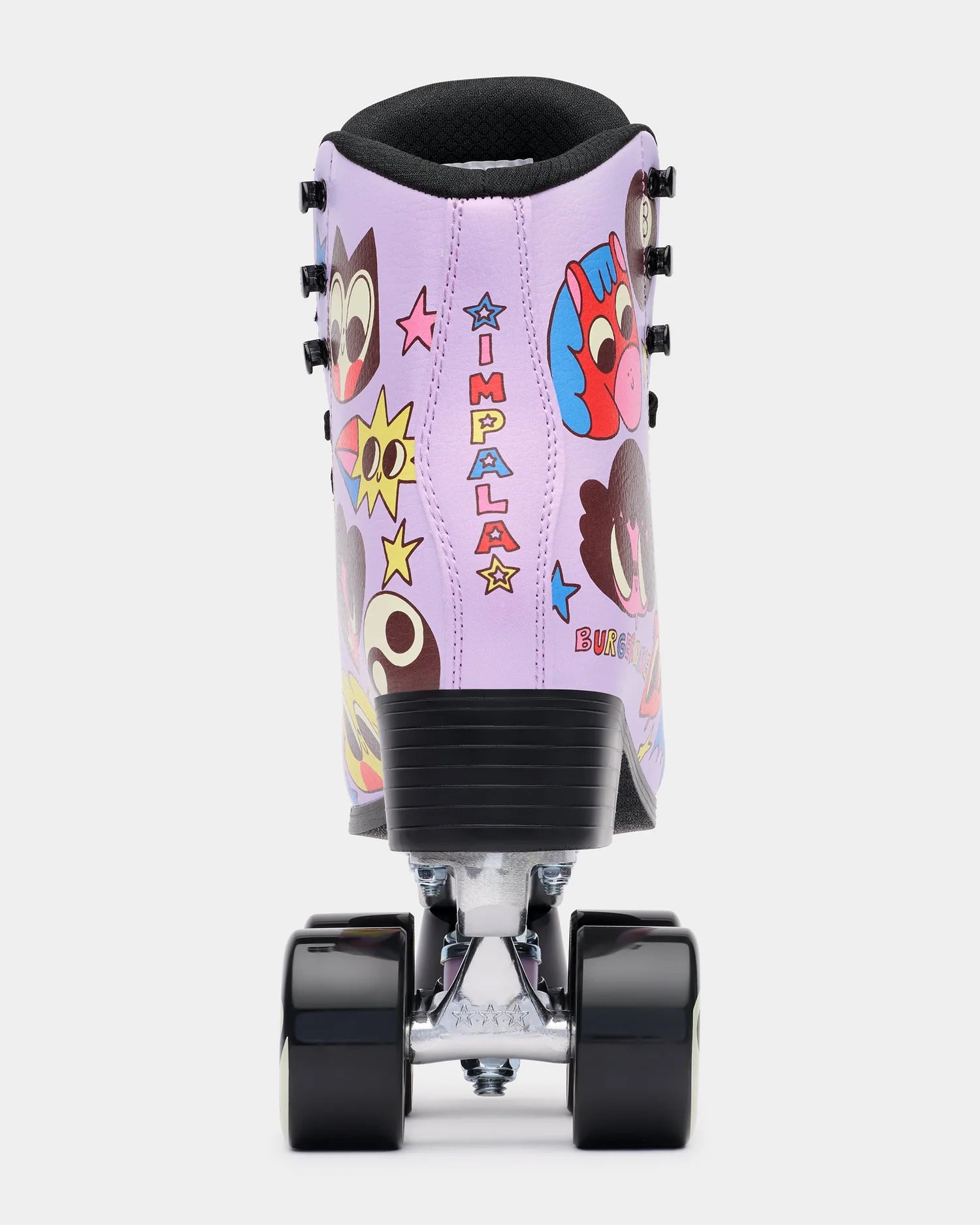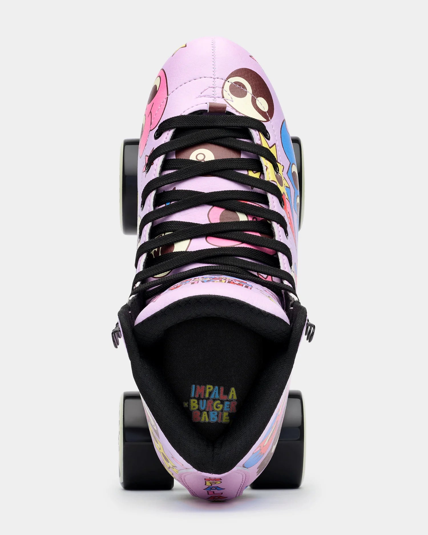 Impala teams up with Burger Babie's wildly creative vision to deliver quad skates that are pure art on wheels. Featuring her signature quirky aesthetic, these skates transform your ride into a statement piece that turns heads everywhere you roll. Lace up, hit the pavement, and become the masterpiece you were always meant to be. Because skating in style isn't just about the moves, it's about owning your vibe.