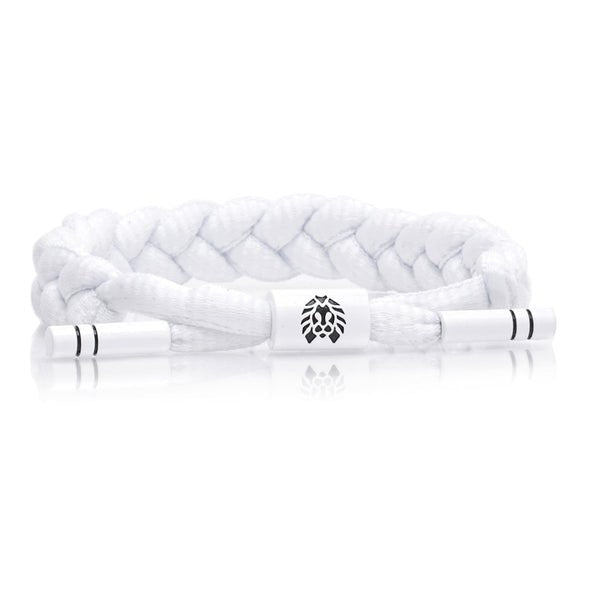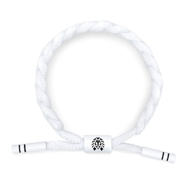 The Level 9 - Medium/Large Rastaclat signifies the will to acquire excellence. This Classic braided bracelet features an all black lace and black hardware, with two white stripes on the ends of the aglets inspired by the martial arts black belt.