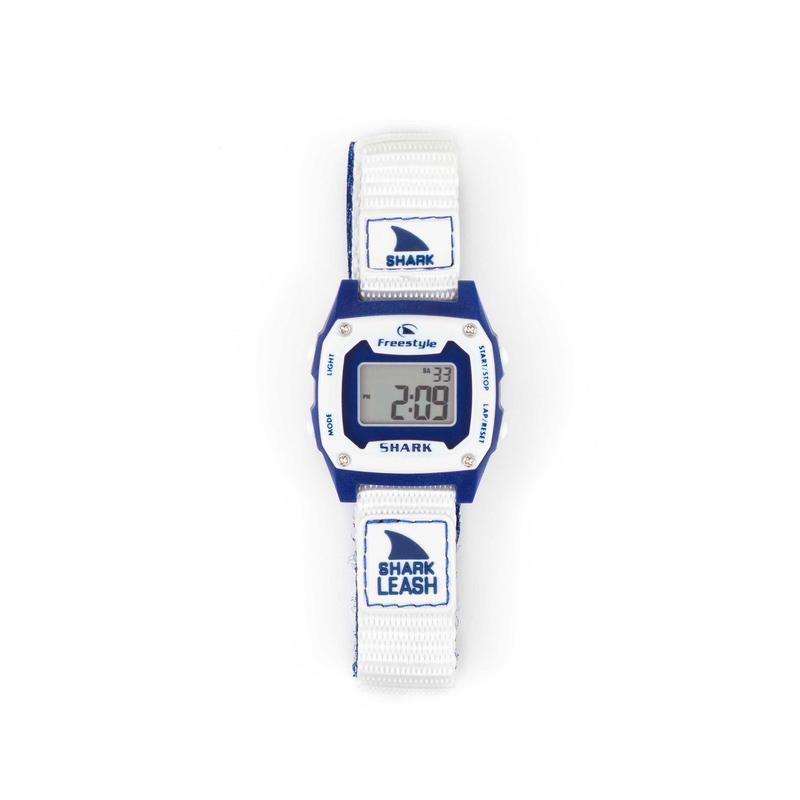 The Freestyle "Navy Sail" Mini Shark Classic Leash Watch offers a compact 30mm case designed for smaller wrists without compromising on functionality. Equipped with an alarm, dual time zone, countdown timer, stopwatch, and night vision backlight, it’s built to keep up with your active lifestyle. Water resistant up to 100 meters and backed by a limited lifetime warranty, this watch combines durability and versatility in a sleek, supportive style.