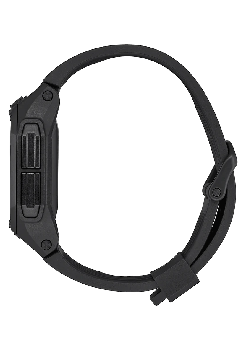 46mm custom injection molded TR-90 case with a 100 meter / 10 ATM water rating. Custom digital LCD module encased in a protective PU jacket and Poron foam padding. Comes with polycarbonate pushers located at 6 and 9 o'clock, hardened mineral crystal, stainless steel bezel, solid stainless steel screw down caseback and screw pin lugs.