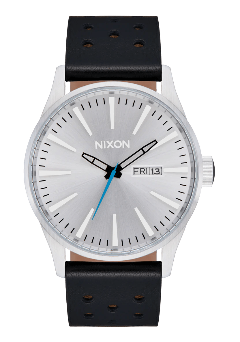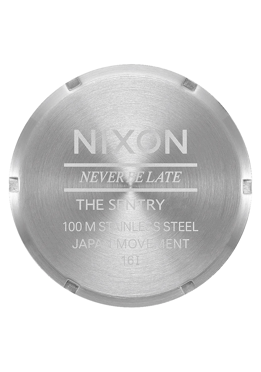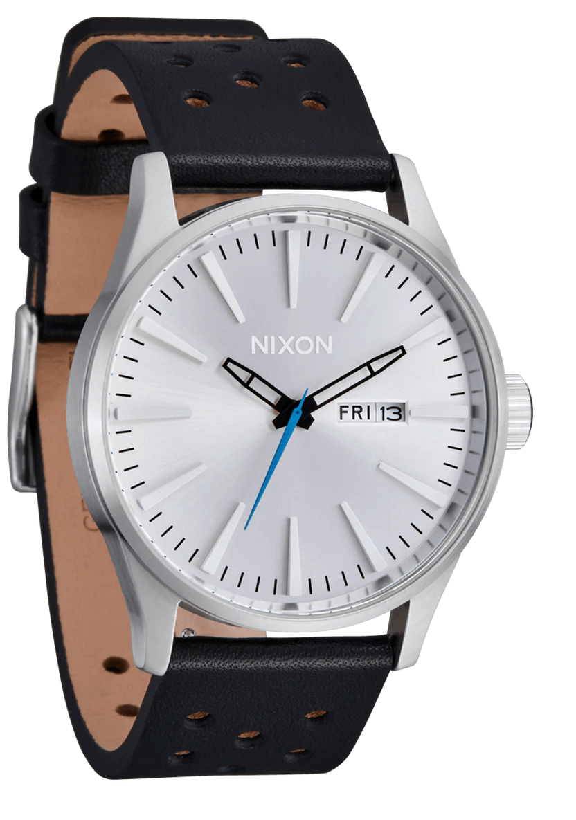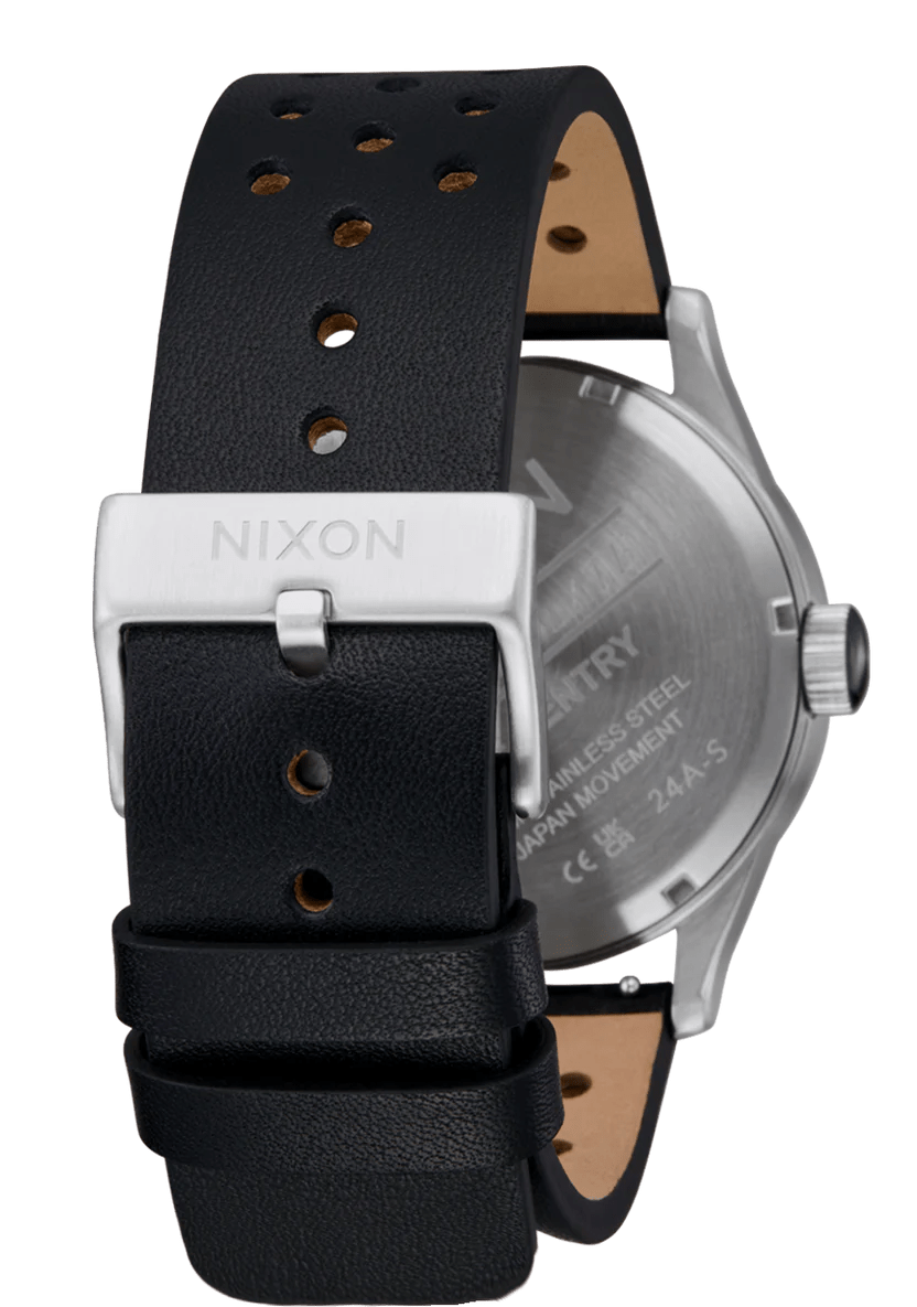 Nixon "Sentry Leather" Watch - Chrome / Silver Sunray / Black