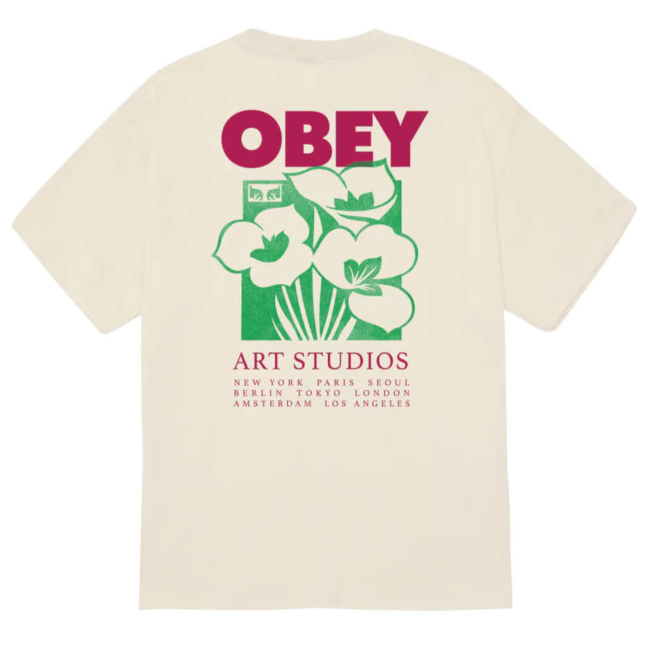 The OBEY "Art Studio Flowers" Classic T-Shirt in Cream blends streetwear style with artistic flair. Featuring a subtle floral graphic, this tee offers a comfortable fit perfect for skating sessions or casual days. Made with soft fabric, it delivers both style and durability, making it a versatile addition to any wardrobe that respects art and urban culture.