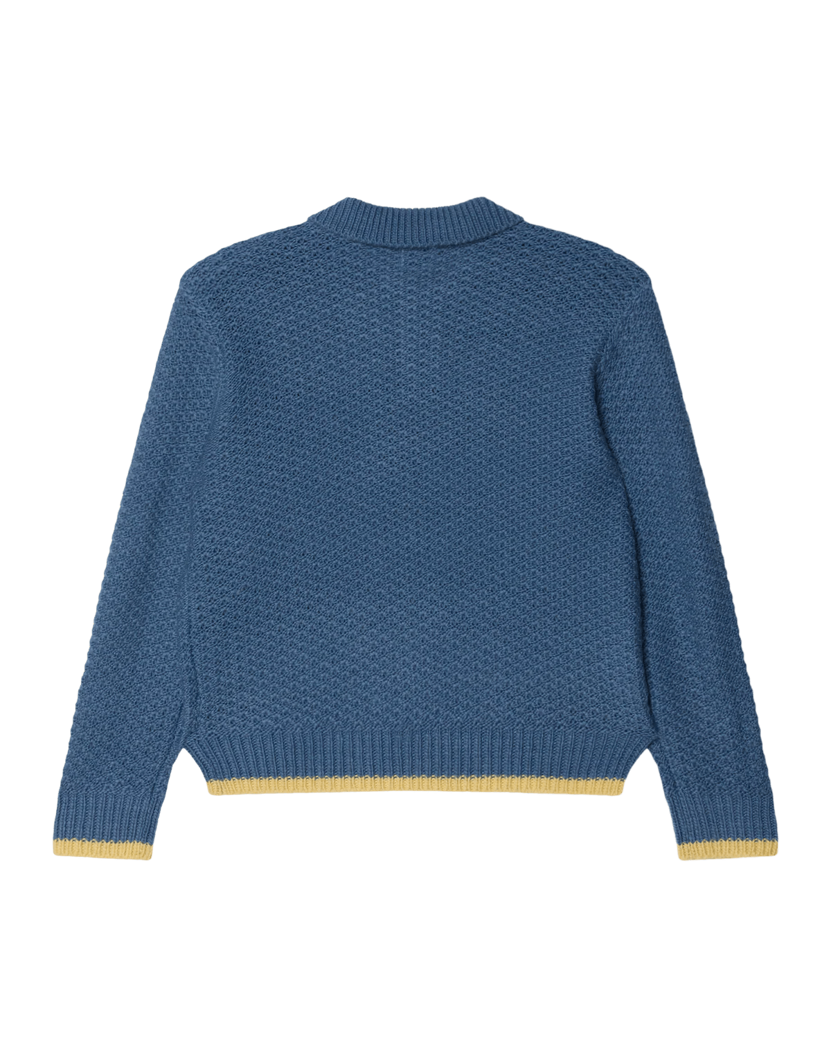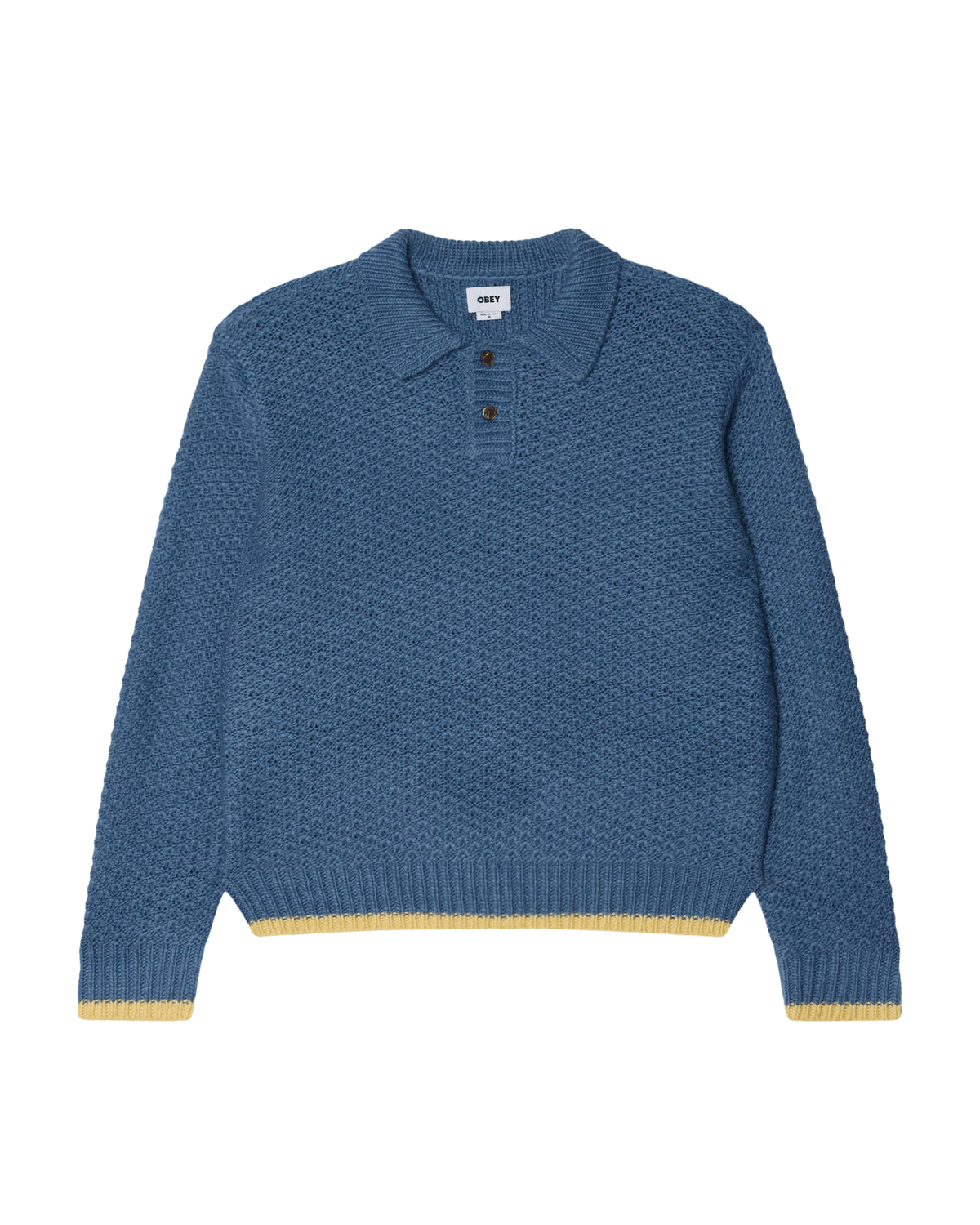 The OBEY "Loreto" Polo Sweater combines streetwear edge with artisanal detail. Crafted from a cozy blend of acrylic, wool, and alpaca, it features a ribbed polo collar and cuffs with striking contrast color accents. The relaxed fit offers effortless style, while the signature OBEY side flag label adds an authentic urban touch. Perfect for layering or making a statement on its own.