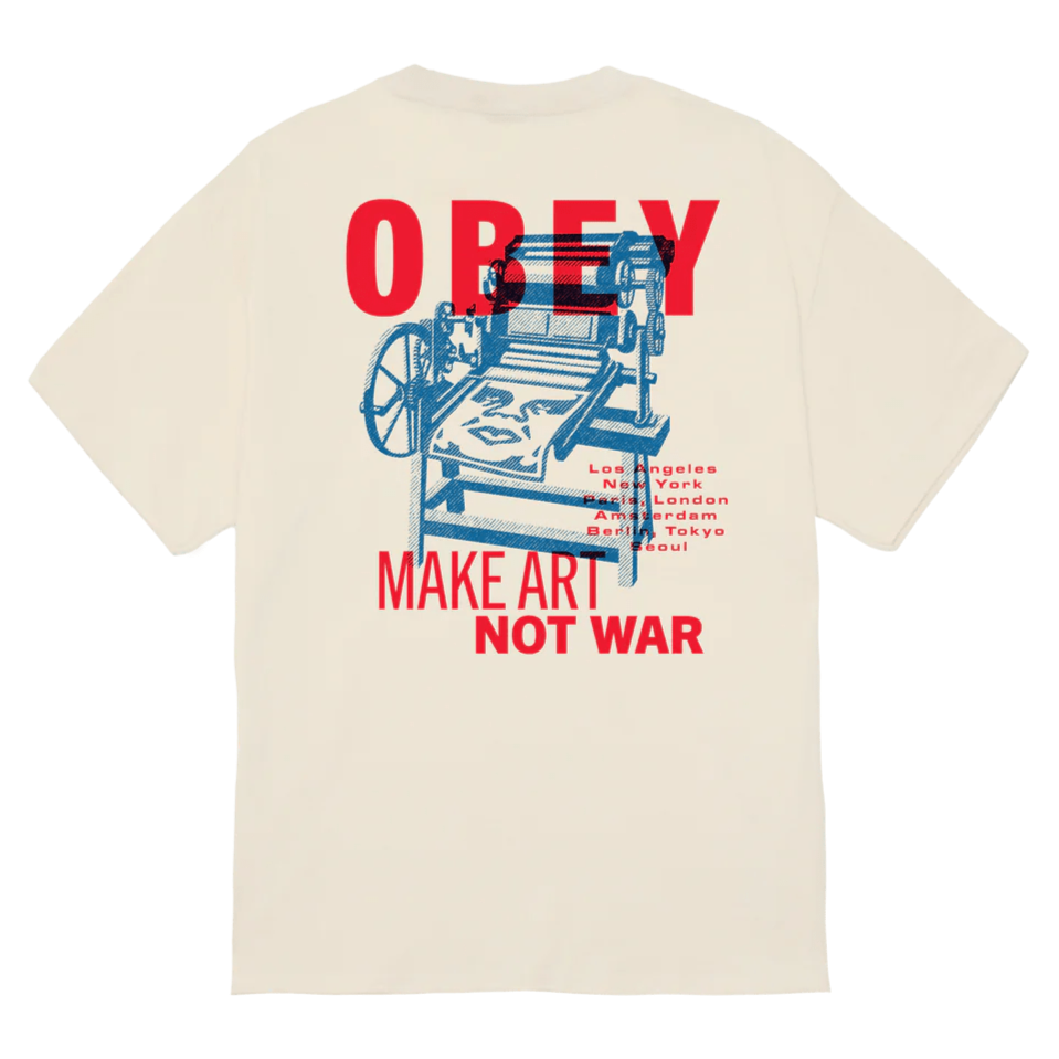 Stay cool and stylish with the OBEY "Printing Press Make Art" Classic T-Shirt. Made of 100% cotton, this regular fit t-shirt features a printed graphic on the front and back. Perfect for any casual occasion, it's a comfortable and effortless way to add a touch of personality to your outfit.