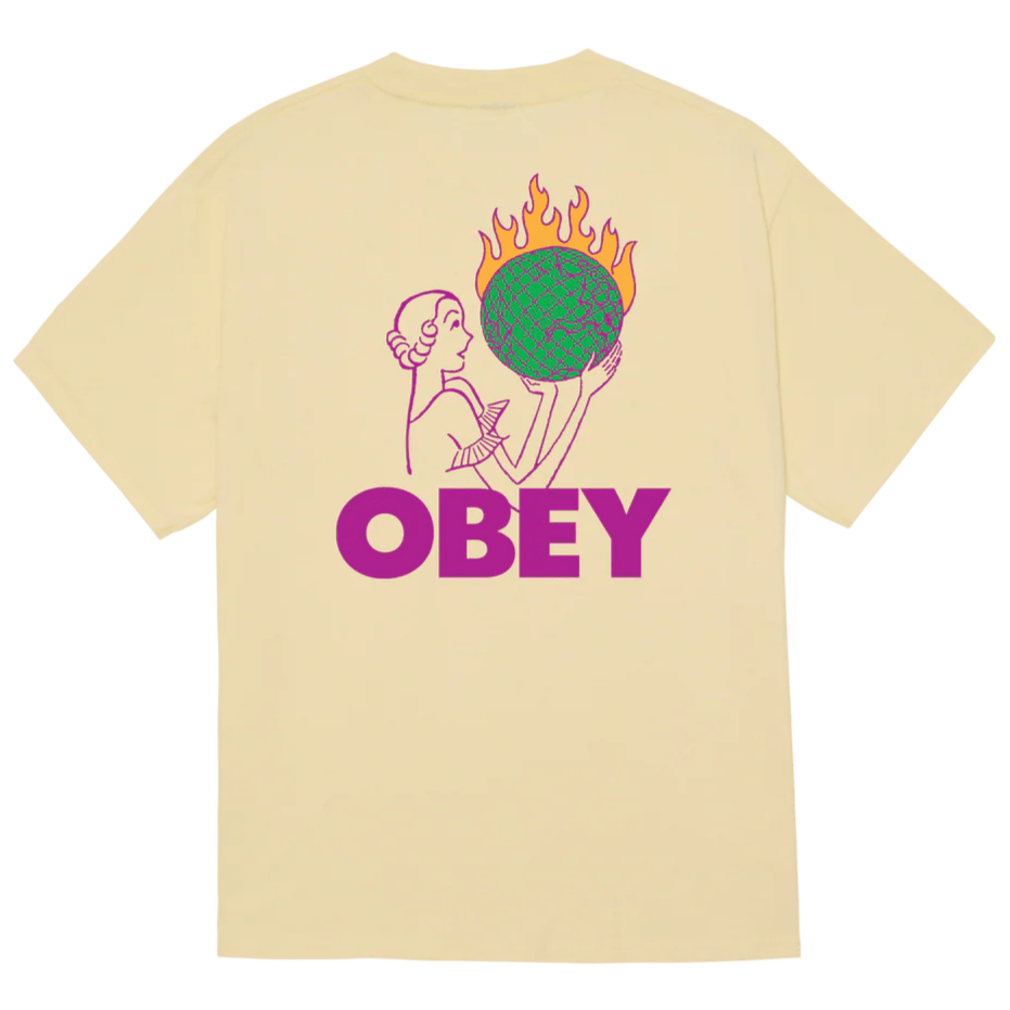 The OBEY "World in Flames" Classic T-Shirt in pale yellow blends bold streetwear with iconic art influences. Featuring a standout design that captures the brand’s rebellious spirit, this tee offers a comfortable fit perfect for skating sessions or casual wear. Its soft fabric ensures all-day comfort, making it a versatile addition to any urban wardrobe.