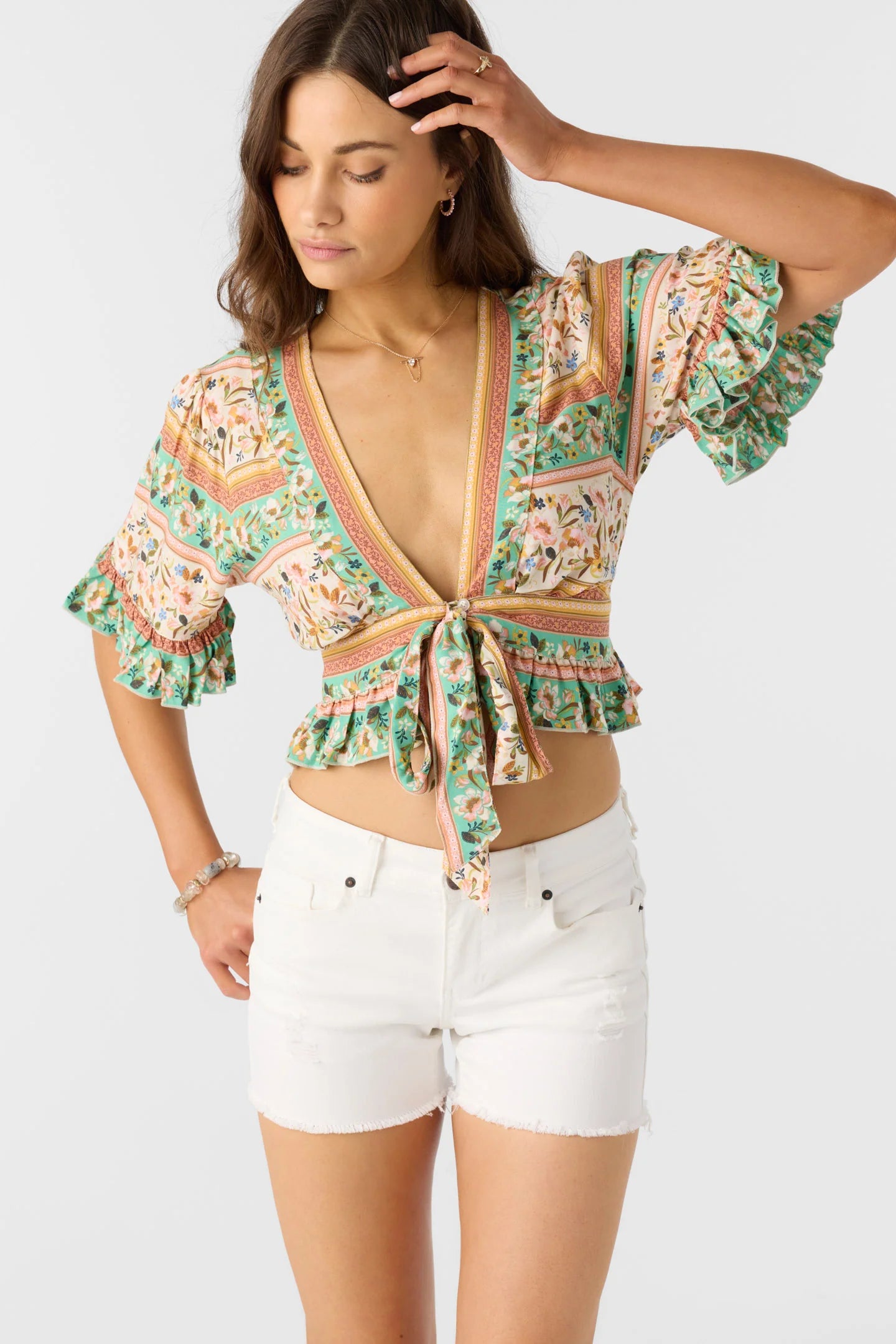 This O'Neill Women's "Harlow" Multiway Top in Tapioca offers a breezy, relaxed fit with a deep v-neckline and self-tie detail, allowing you to wear it in multiple ways. Made from 100% viscose, it features an allover print and button closure for added style. Its regular length and versatile design make it a comfortable and flattering choice for everyday wear.