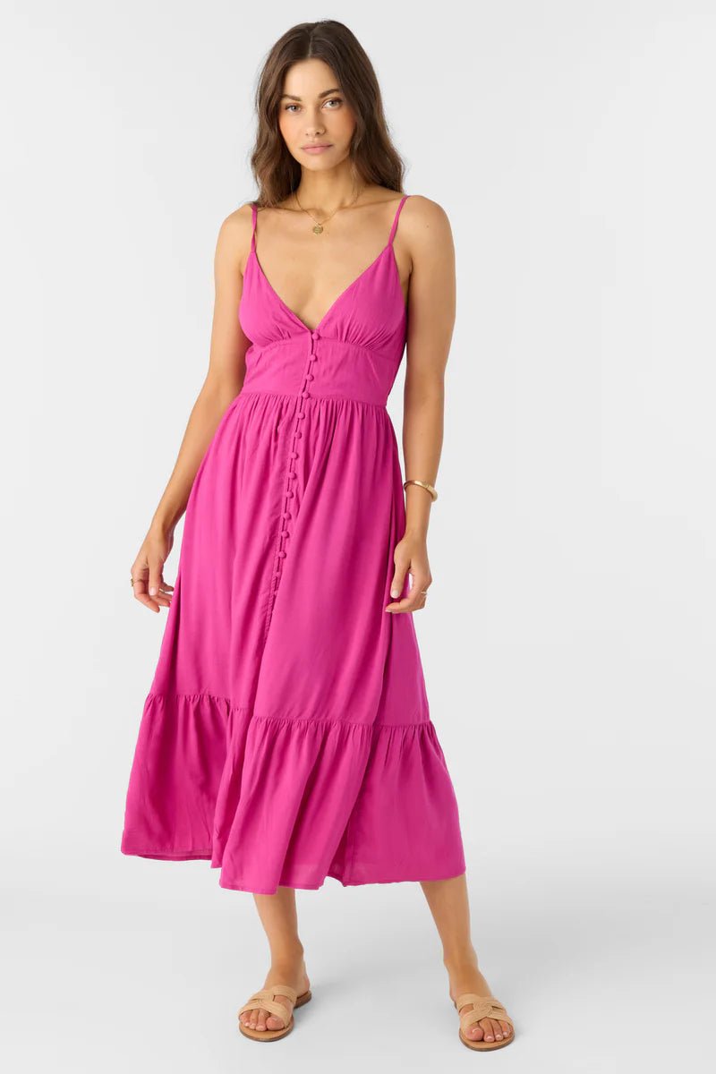 Step into summer with the O'Neill Women's "Pilar" Midi Dress in vibrant fuchsia. This dress features a flattering V-neckline and button-front closure for easy wear. Adjustable straps and an elastic back provide a comfortable, customizable fit, while the tiered skirt adds playful movement perfect for warm days and breezy evenings.