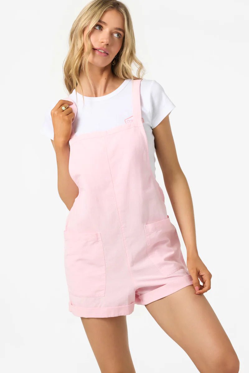 The O'Neill Women's "Summerlin" Romper in Fairy Tale Pink offers a comfortable and stylish choice for warm days. Made from a light cotton blend, it ensures breathability and ease of movement. Featuring front patch pockets and adjustable straps, this romper combines practicality with a flattering fit. Perfect for casual outings, it supports your active lifestyle while keeping you looking effortlessly chic.