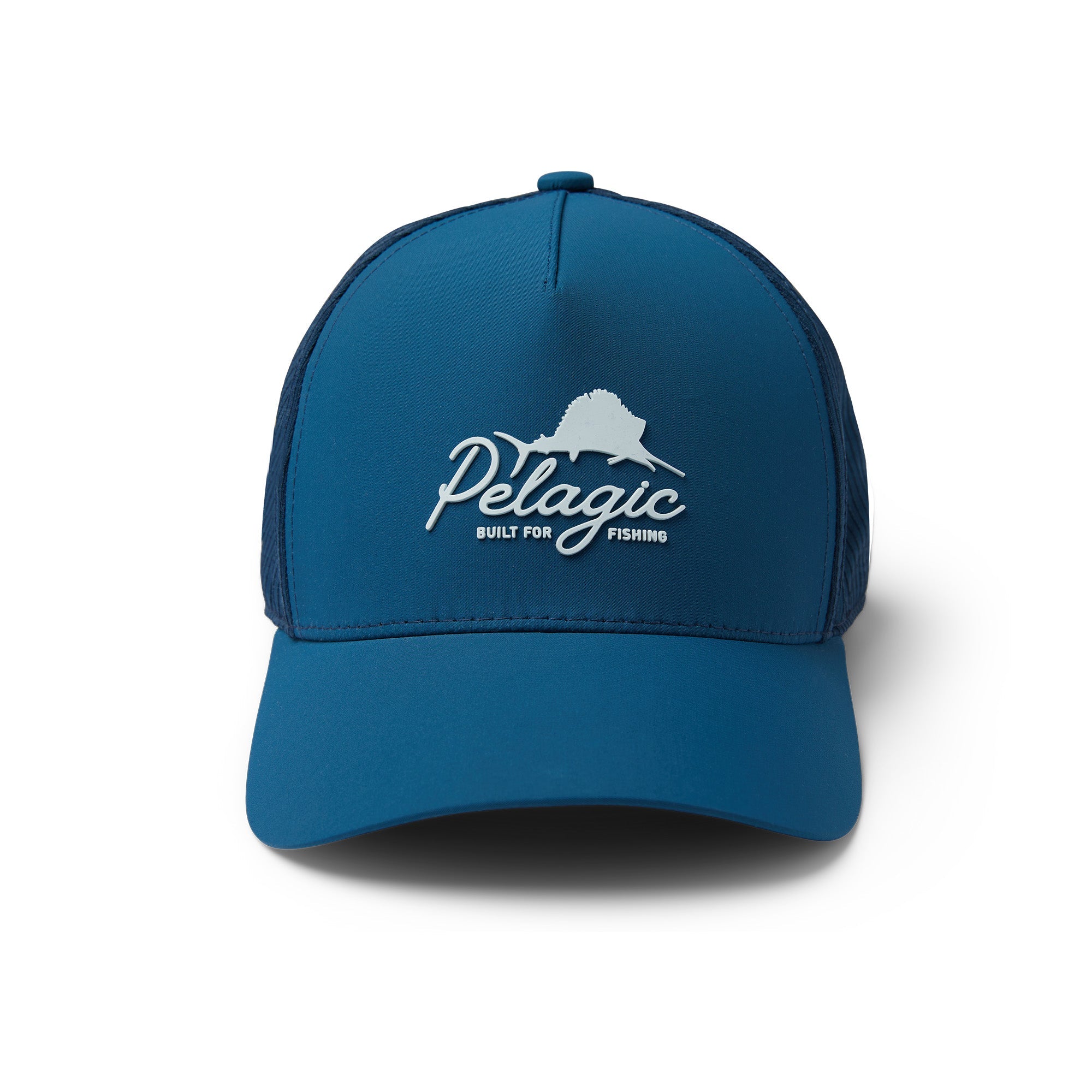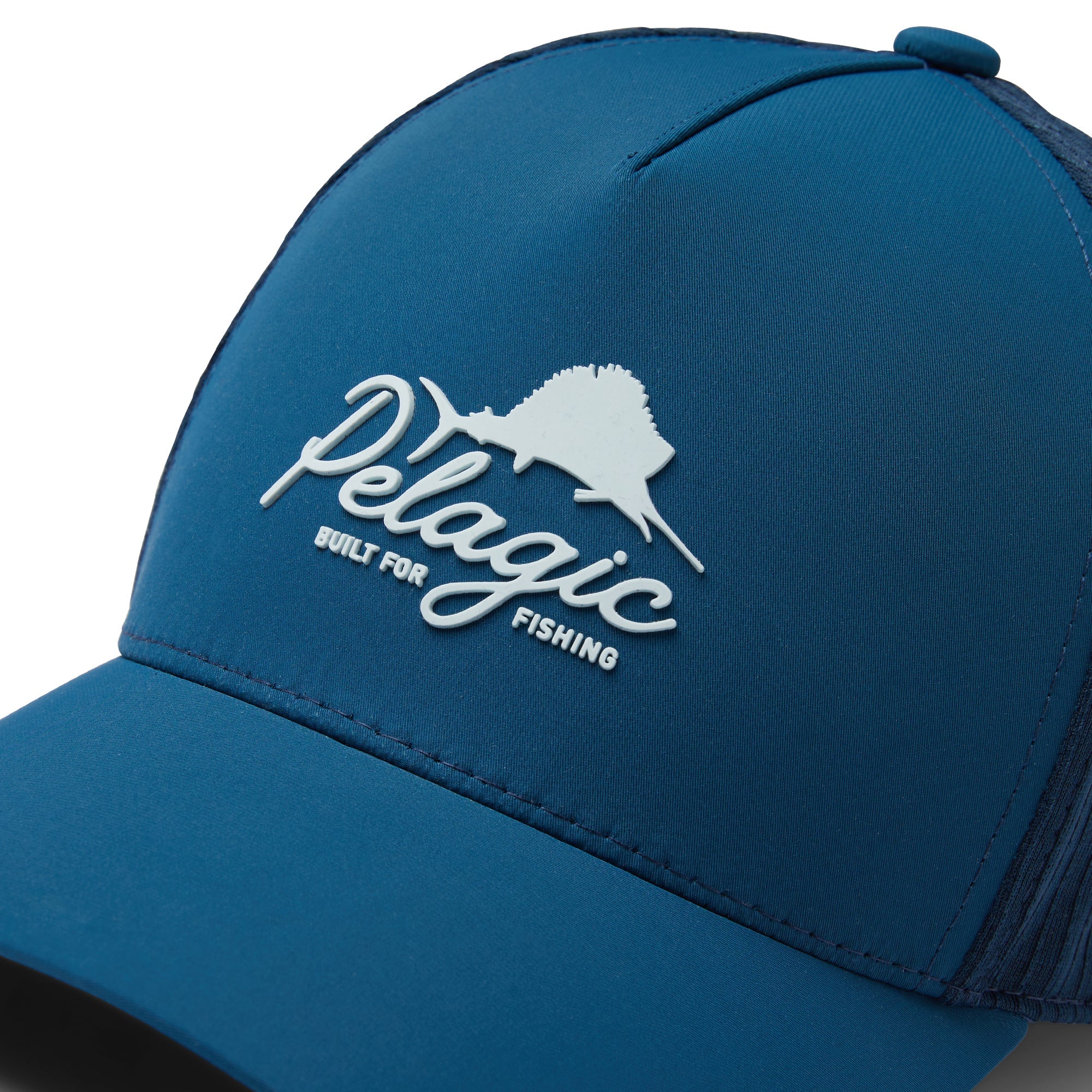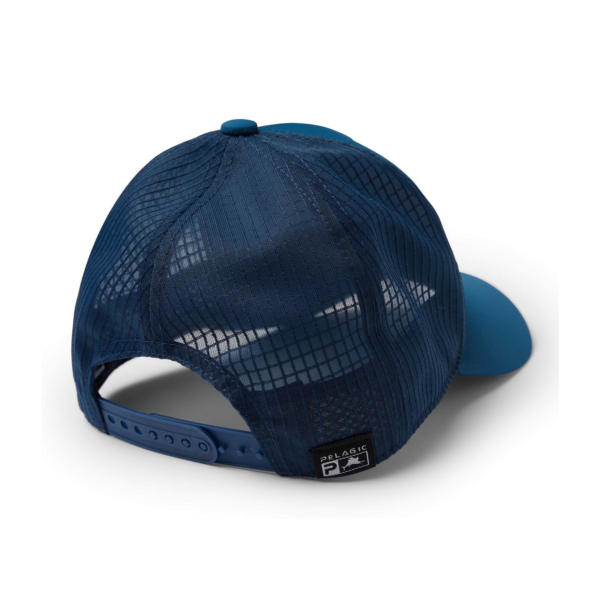 Introducing the Pelagic "Echo" Women's Performance Trucker Hat in navy. Our most advanced hat yet. Features micro-mesh trucker back panels for airflow. Ultra-lightweight with water repellant bill and crown. Absorbent, padded headband for dry, comfortable fit. Customizable bill for flat or curved style.