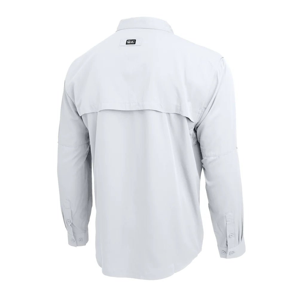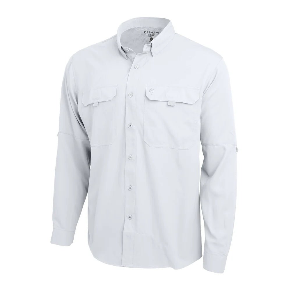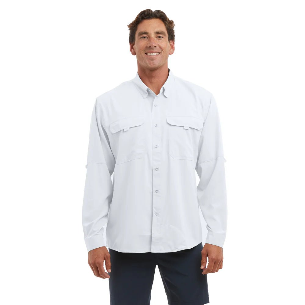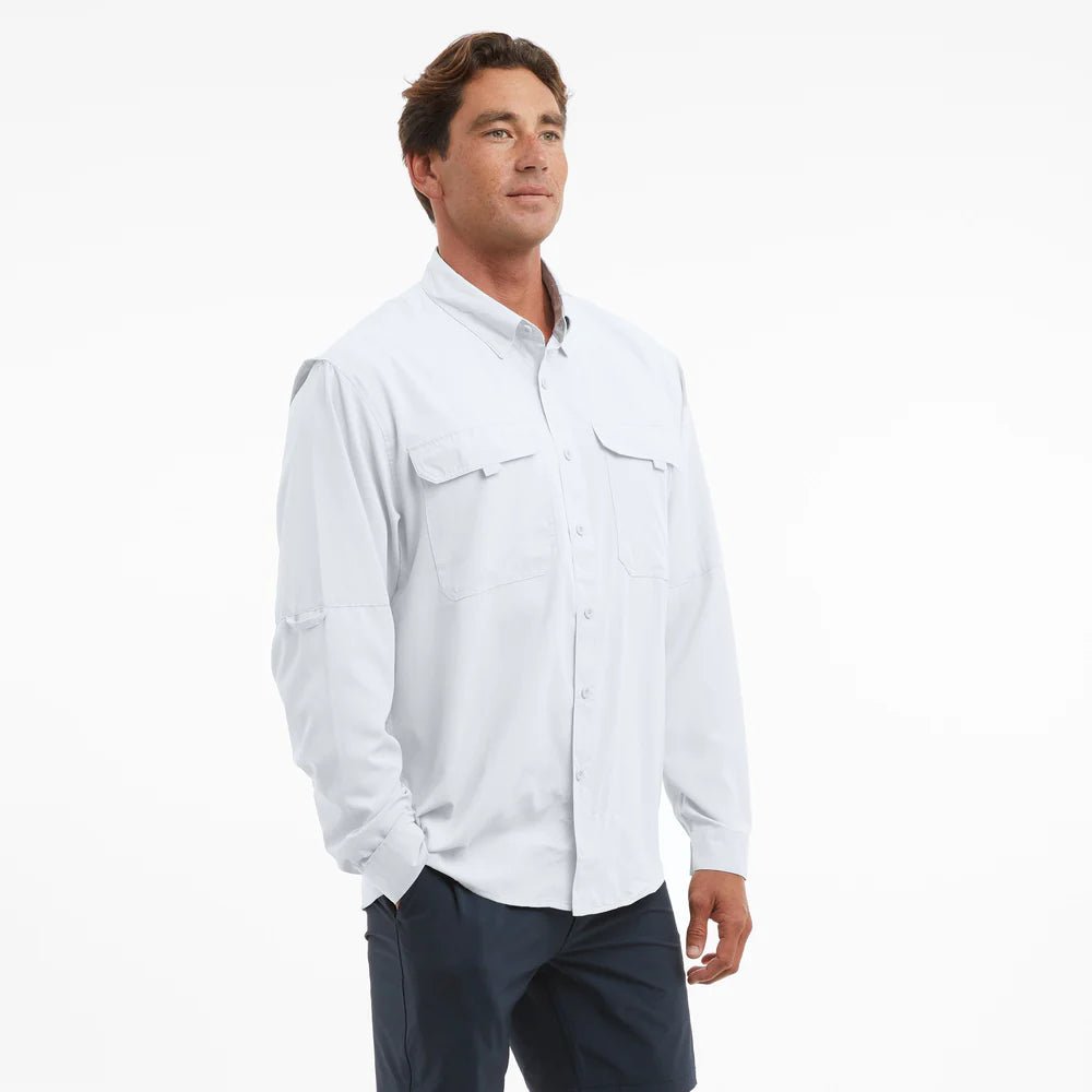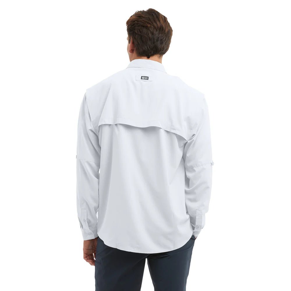 Designed for those long warm days on the water, the Pelagic "Keys" Men's Long Sleeve Guide Fishing Shirt in white delivers 50+ UPF protection to shield you from the sun. Crafted from ultralight, quick-dry recycled fabric with 2-way stretch, it ensures comfort and freedom of movement. Its PFAS-free water and stain repellency keep you looking sharp, while strategic ventilation enhances airflow to keep you cool when the action heats up.