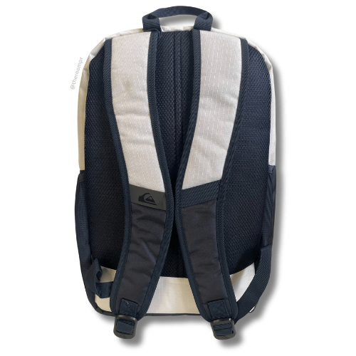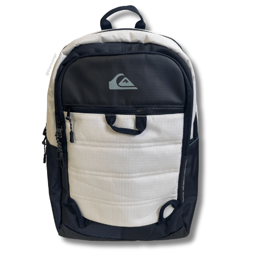 The Quiksilver Ignition 23L Backpack in White and Navy offers organized storage with an internal laptop sleeve, front pockets featuring an accessory organizer, and a secondary compartment. Side mesh pockets keep your water bottle within easy reach. Adjustable padded straps ensure comfortable carrying throughout your day. This backpack is designed to support your active lifestyle with practical features and reliable comfort.