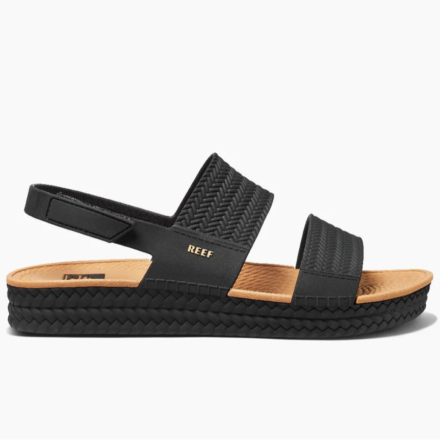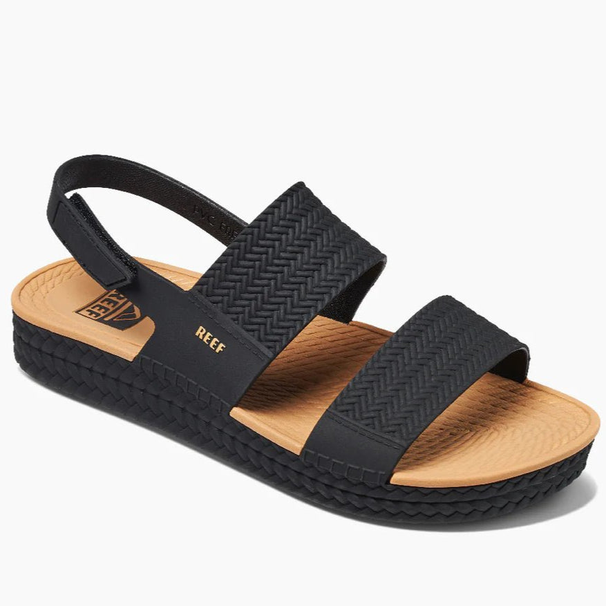 Step into comfort and style with the Reef "Water Vista" Women's Sandals in Black / Tan. Designed with espadrille-inspired braids and jute-like rope carvings, these sandals bring coastal charm to every step. Water-friendly materials make them quick to dry and easy to clean, perfect for beach days or casual outings. The dual-density footbed offers cushioned support, while the adjustable velcro backstrap ensures a secure, customized fit. Whether you're flowing through sunrise yoga or relaxing at sunset, these sandals combine practicality and elegance effortlessly.