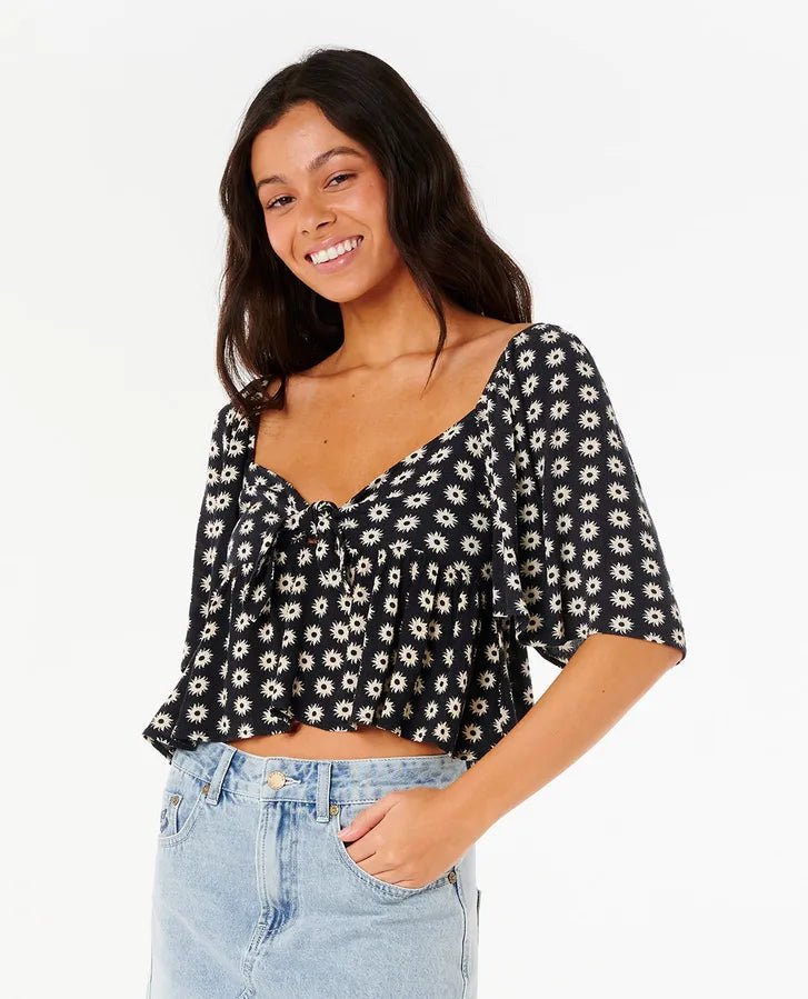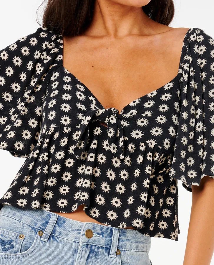 Elevate your summer style with the Rip Curl Cala Nights Top. Made from Lenzing™ Ecovero™ crinkle fabric, this flowy top exudes effortless elegance. The playful tie-front detail and soft silicon wash add a touch of luxury, while the all-over print adds a burst of color. Perfect for sunny days.