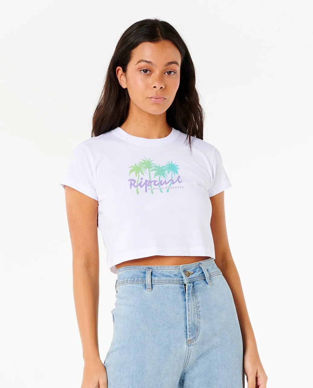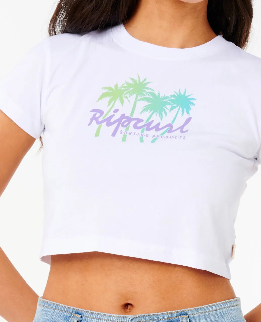 The Rip Curl Women's Es Vedra Baby Tee offers a stylish blend of softness and edge, crafted from stone-washed cotton jersey for a lived-in comfort. Its fitted, cropped cut flatters your silhouette, making it an ideal match for high-waisted shorts or breezy skirts. Featuring a distinctive front print, this tee effortlessly transitions from beach days to casual outings, adding a touch of personality to your summer wardrobe. Perfect for layering or wearing solo, it embodies laid-back, feminine charm with every wear.