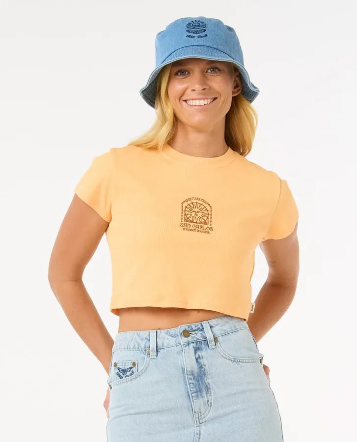 Introducing the Rip Curl Women's San Carlos Baby Tee - a timeless blend of comfort and style. Made from 95% cotton and 5% elastane, this stretch cotton rib tee offers a snug fit, while the delicate embroidery and woven flag label add a touch of vintage charm. The inner neck label guarantees a comfortable finish, making this tee a must-have for any fashion-forward wardrobe.
