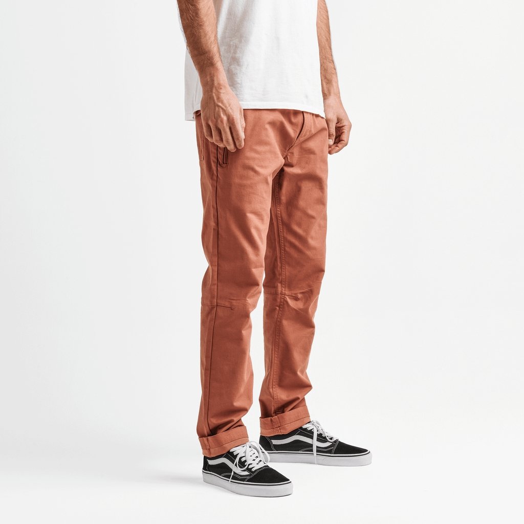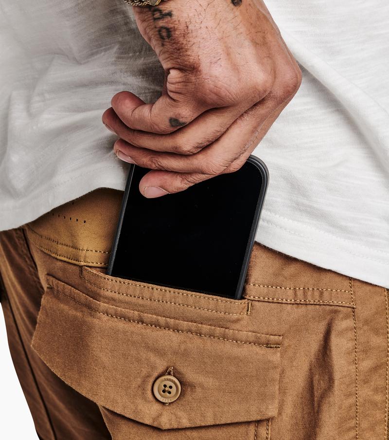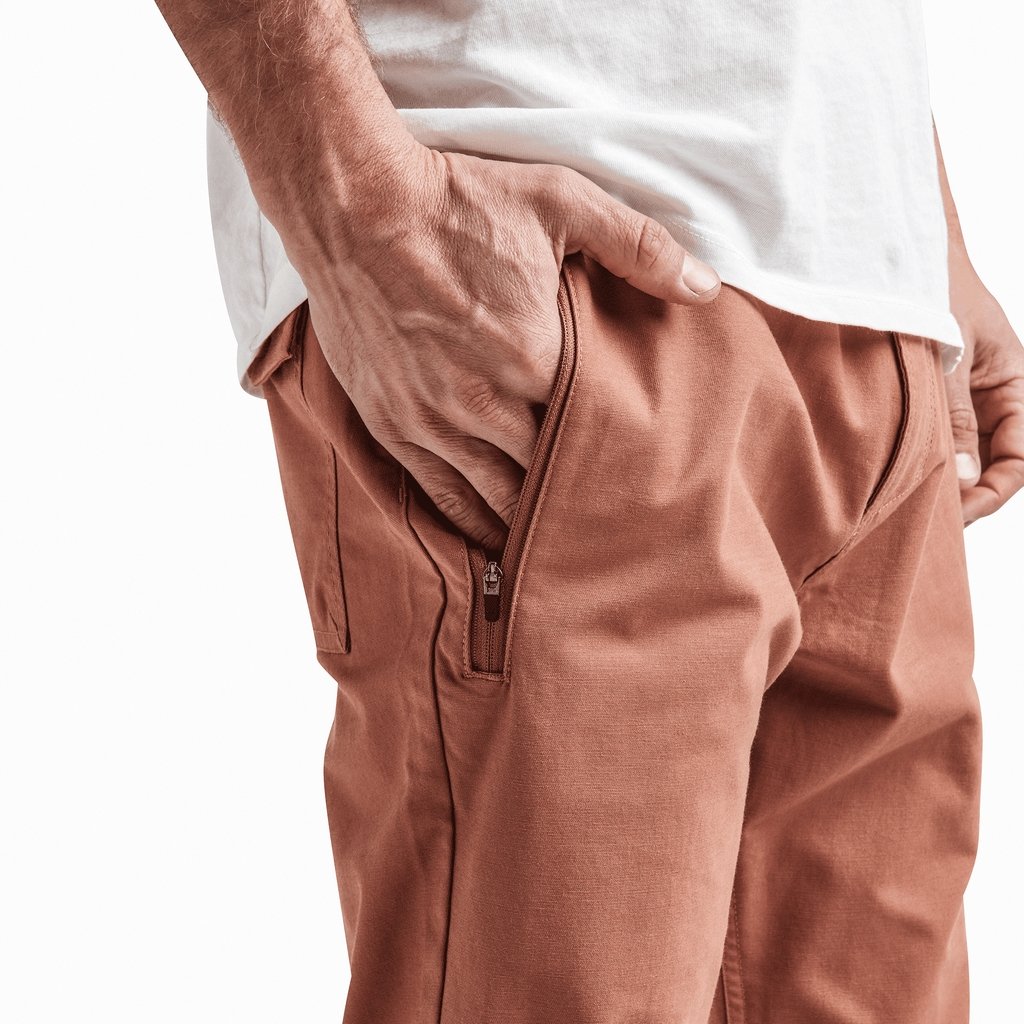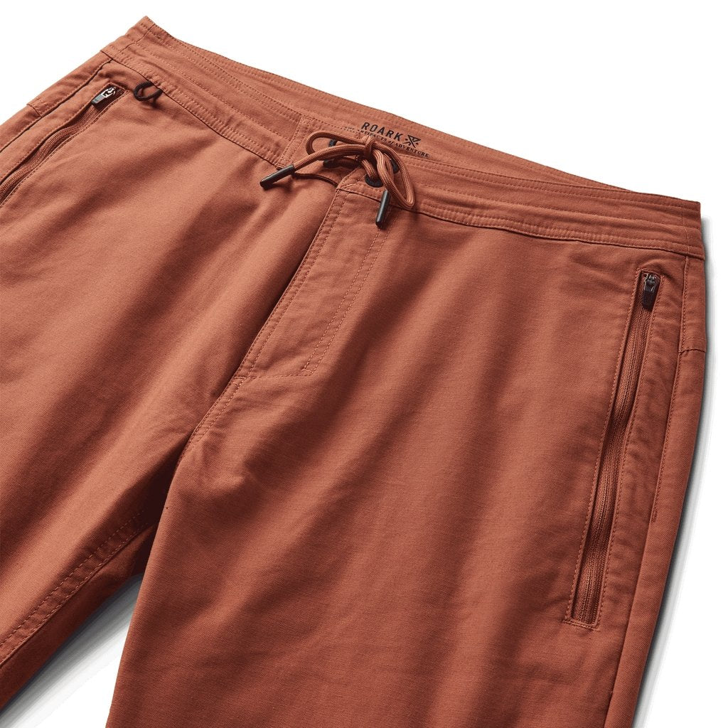 An evolved version of Roark's slim, straight fit, travel pant. Drawstring closure that wraps entire waistband with zipper fly, front extended long zip pocket with internal stash sleeve intended to accommodate all travel documents. Back patch pocket with button closure and small stash pocket at back yoke for quick cell phone storage.The back yoke vented mesh panel now constructed with laser cut perforations for breathability and comfort.