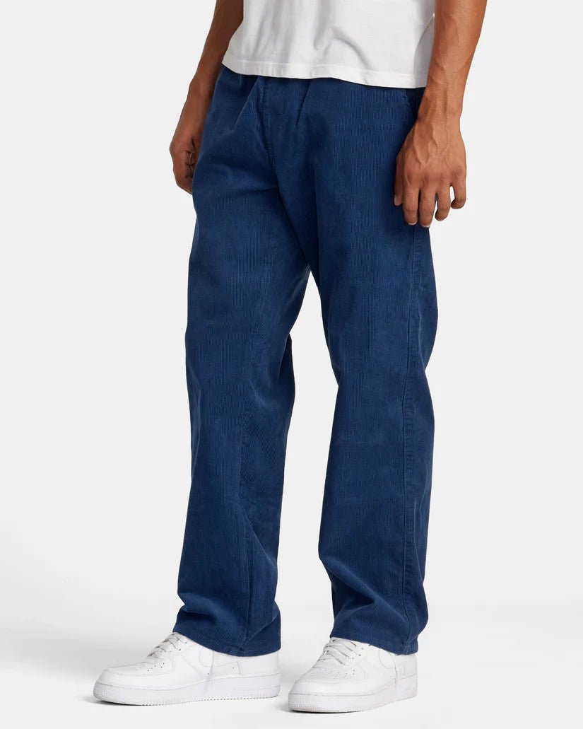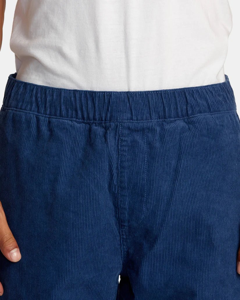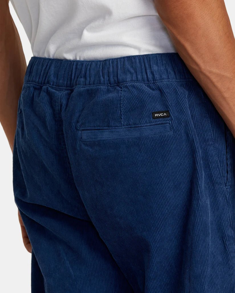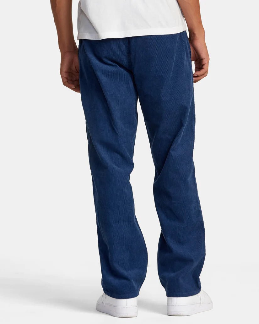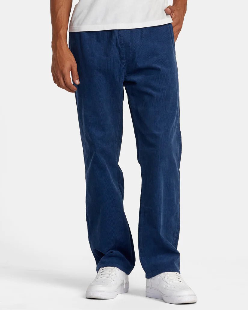 Experience both comfort and style with the RVCA "Americana" Elastic Waist Corduroy Pants. These men's pants feature a relaxed fit, Elastic Waist with an internal drawcord, faux fly, and convenient pockets throughout. With reinforced seams and woven RVCA branding, these Pale Mauve pants are a vintage fashion must-have.