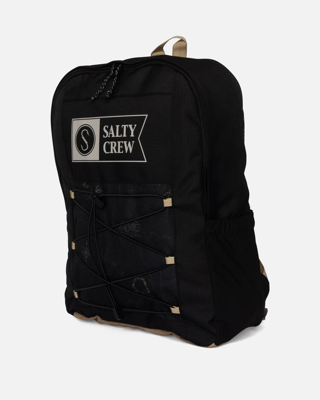 The Salty Crew "Alpha Print" Backpack in Black combines durability and style with its 600D polyester ripstop fabric and DWR coating. Measuring 18 x 16 x 5 inches with a 25-liter capacity, it features a spacious main compartment and a padded pocket designed for laptops up to 15 inches. External zippered pockets and dual side water bottle holders offer organized storage, while padded air mesh shoulder straps and back panel ensure comfortable wear. Available in multiple prints and colors, this backpack is a refined choice for everyday use.
