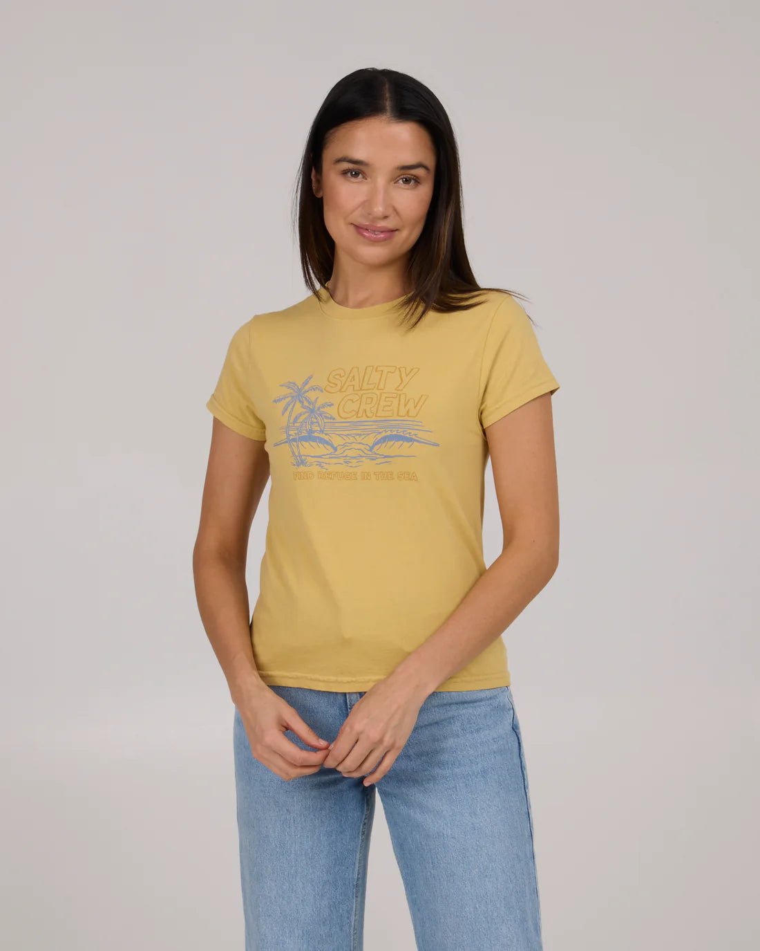 Get comfortable in style with the Salty Crew Women's A-Frame Modern Tee. Made from 100% cotton jersey, this tee is slightly fitted with cap sleeves and a skimmer length body for a flattering fit. The screen print design on the front chest adds a touch of uniqueness to this dusty gold shirt.