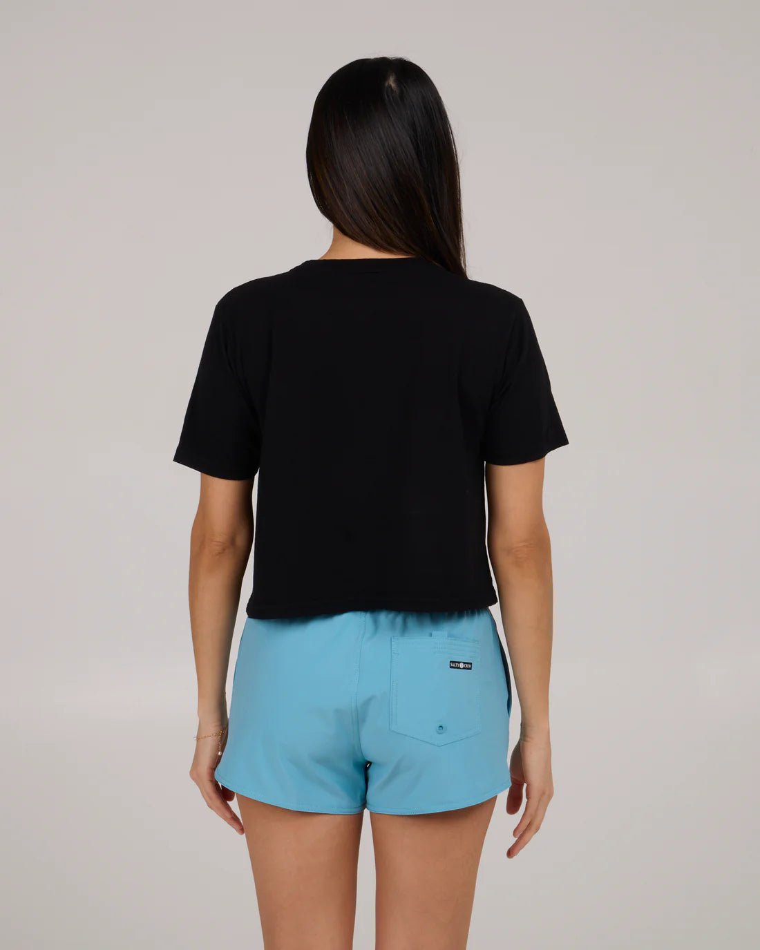 The Salty Crew Women's Ashore Crop Tee in black offers a comfortable and stylish addition to your wardrobe. Made with 100% cotton jersey, this cropped boxy fit tee features a screen print at the front chest for a cool and unique look. Perfect for any casual outing, this tee is a must-have for any fashion-forward individual.